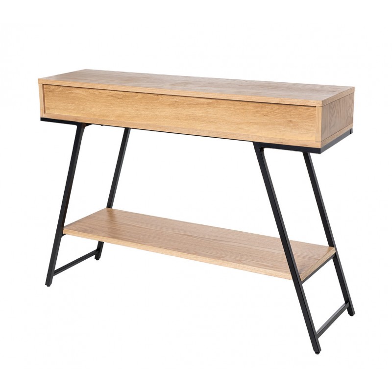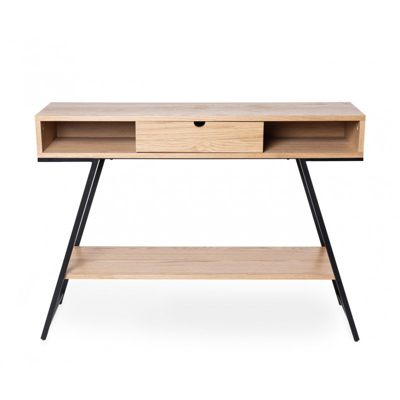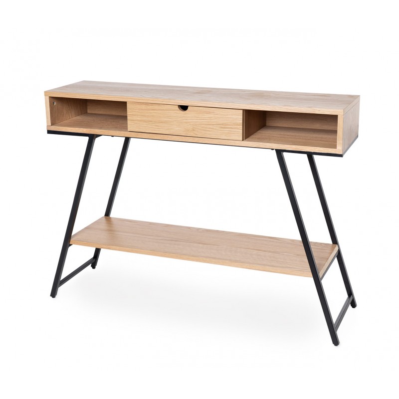 La consola SAMI es un mueble auxiliar de líneas rectas que combina chapa de roble natural y estructura metálica en acabado negro. Su diseño ligero con patas en forma de “A” aporta estabilidad visual y carácter contemporáneo.