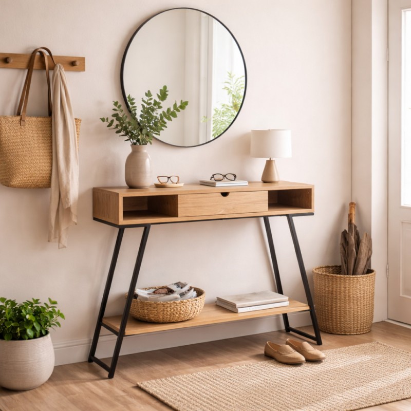 La consola de madera y metal SAMI puede utilizarse como mueble de recibidor para organizar llaves y objetos personales, como consola auxiliar en salón para elementos decorativos o incluso como pequeño escritorio en espacios compactos. Su balda inferior permite almacenar cajas, libros o cestas, optimizando el espacio vertical.