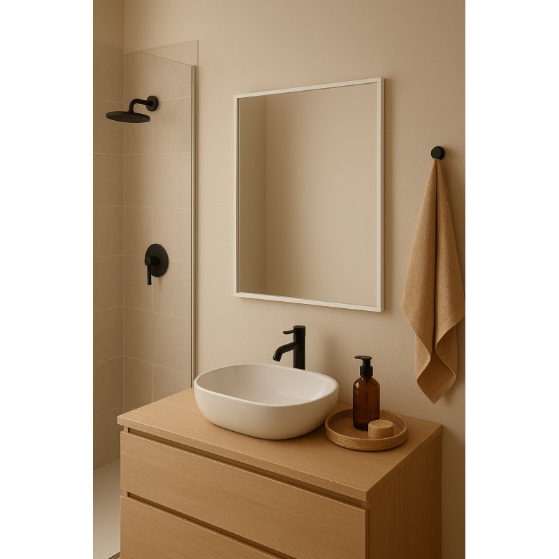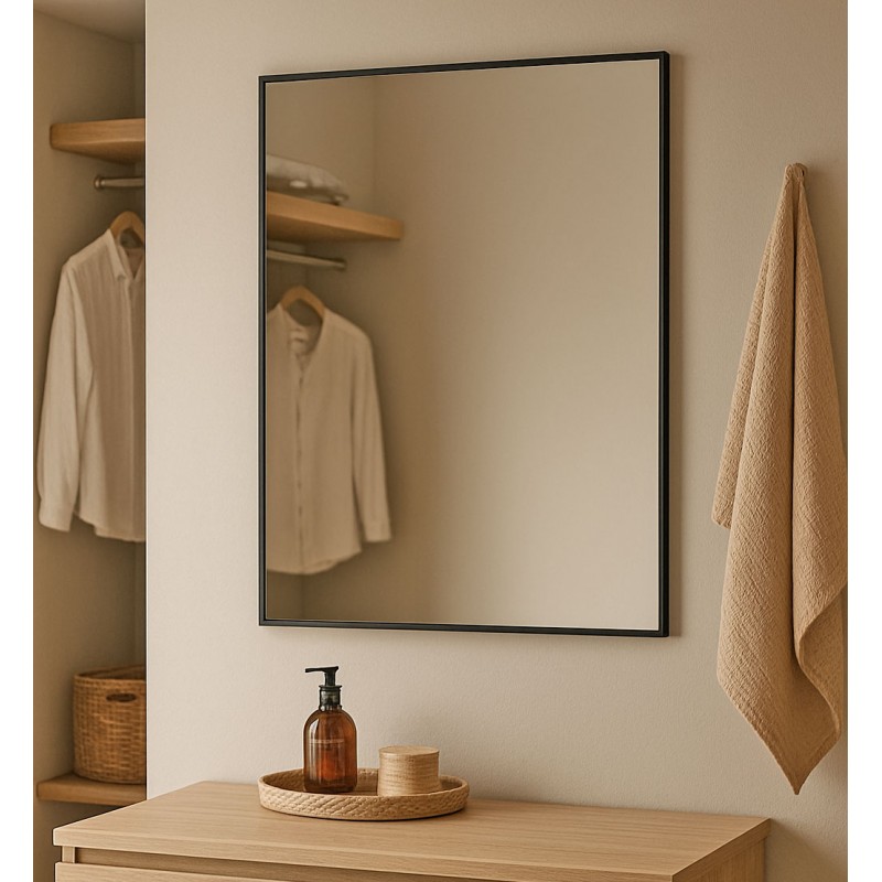 Su estructura delgada aporta ligereza visual y ayuda a ampliar ópticamente el espacio, reflejando la luz natural con sutileza. Ideal para baños, recibidores o dormitorios, este espejo se convierte en un elemento práctico sin renunciar al estilo.
