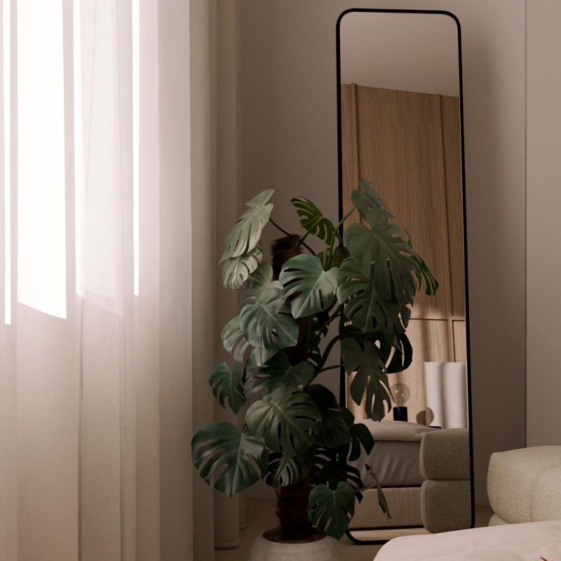 El espejo de pie RODAS permite comprobar el conjunto completo de ropa, preparar looks diarios o ampliar visualmente la luz de la estancia cuando se coloca frente a una ventana. Su formato estrecho resulta especialmente útil en dormitorios con espacio limitado, vestidores o recibidores.