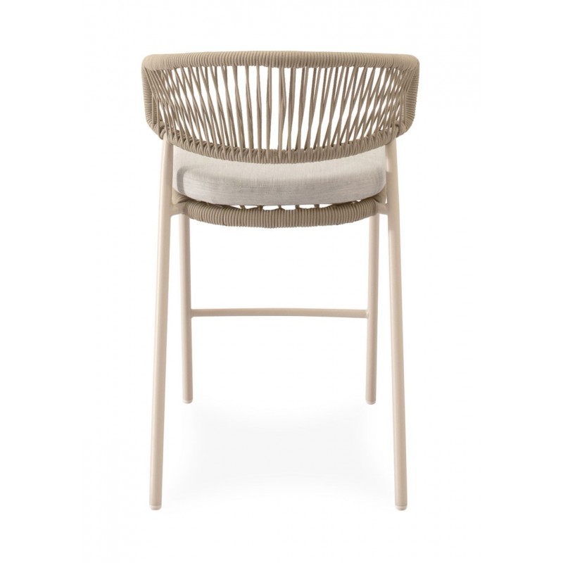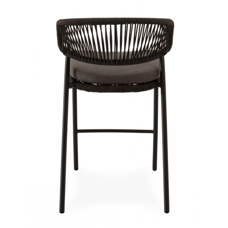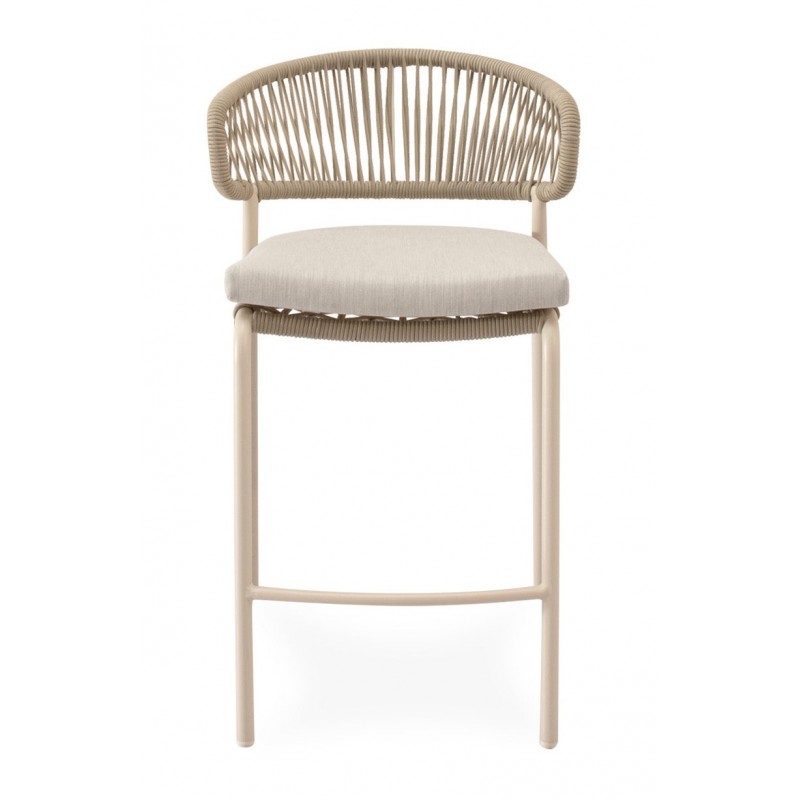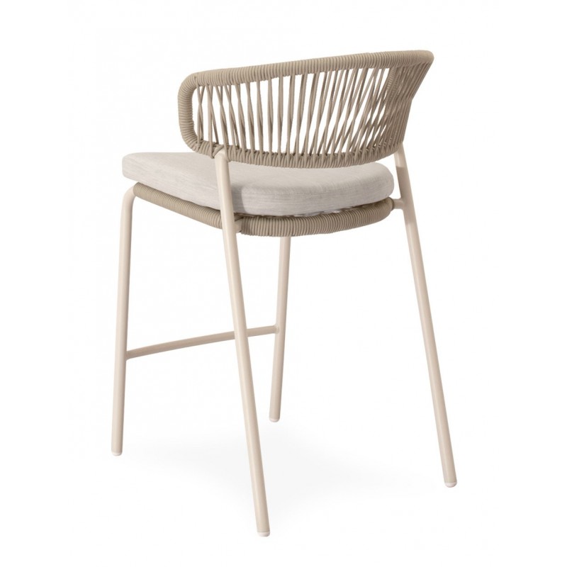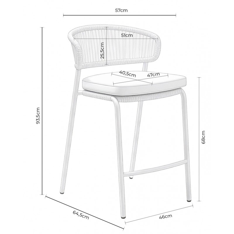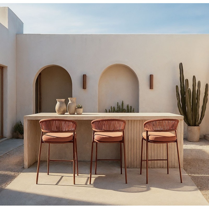 El taburete de exterior RANDALL destaca por su enfoque minimalista y elegante, con un diseño que prioriza tanto la estética como la funcionalidad. Su respaldo curvo, elaborado en cuerda sintética de alta resistencia, se eleva ligeramente separado del asiento, creando un efecto visual liviano y permitiendo una ventilación óptima.