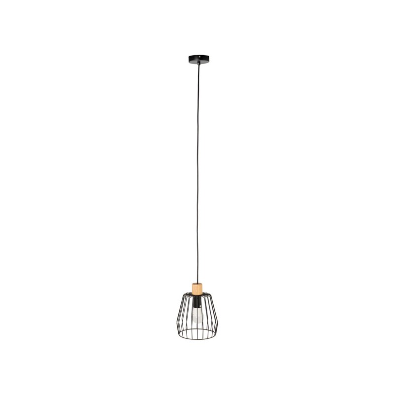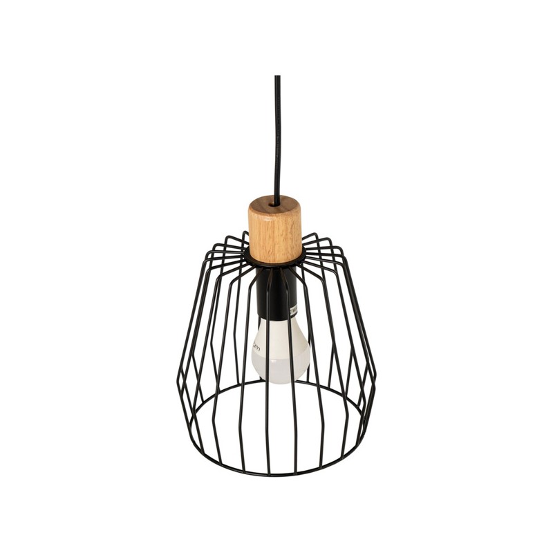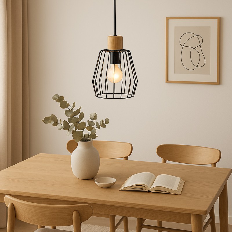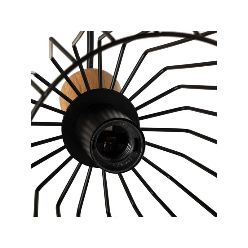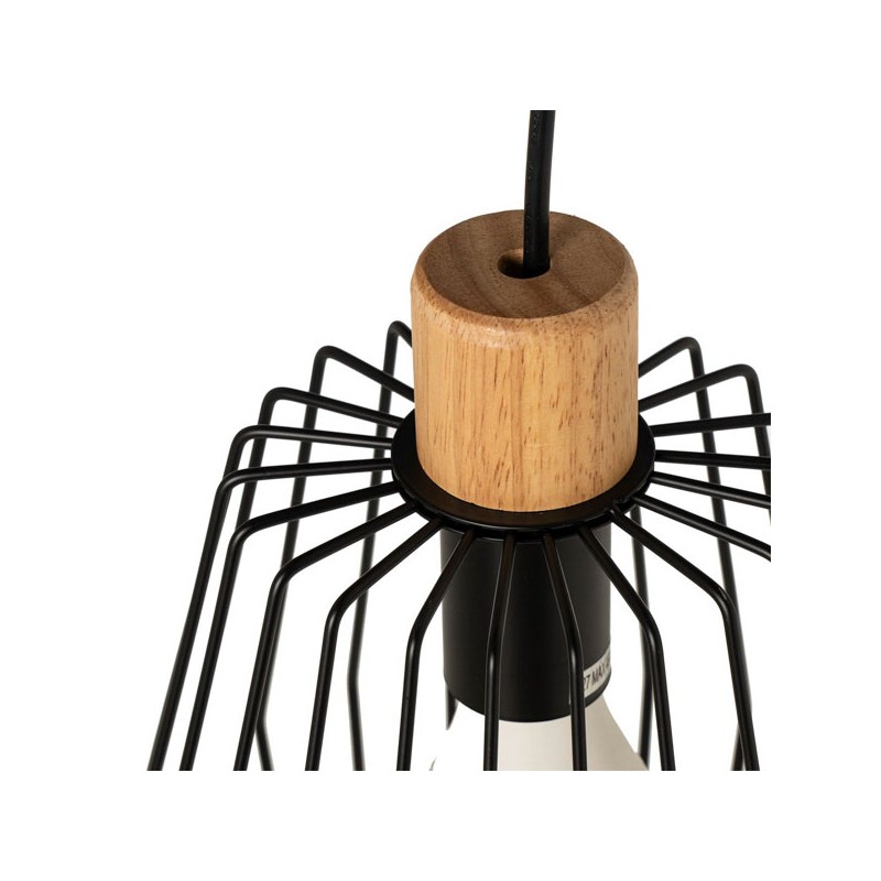 La lámpara de techo FAURA es una pieza colgante de diseño industrial que combina estructura metálica en negro con detalles en madera natural. Su forma geométrica abierta permite una difusión uniforme de la luz, manteniendo un estilo funcional y decorativo.