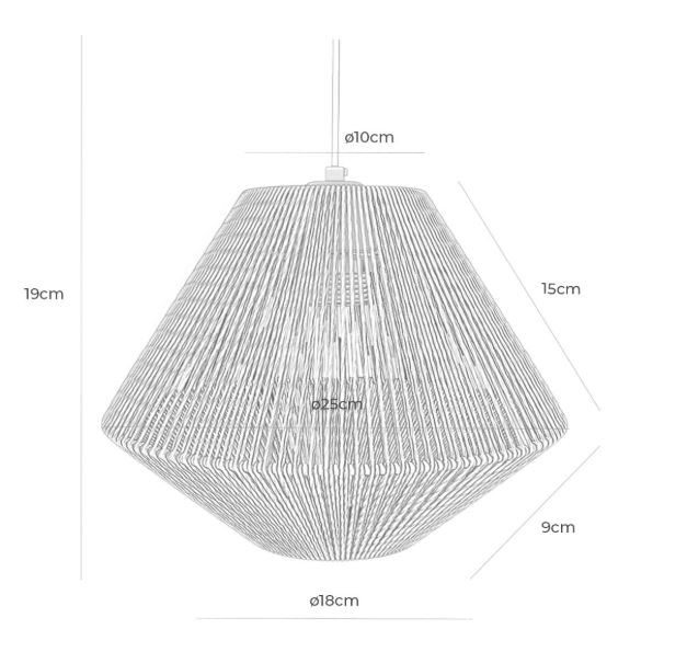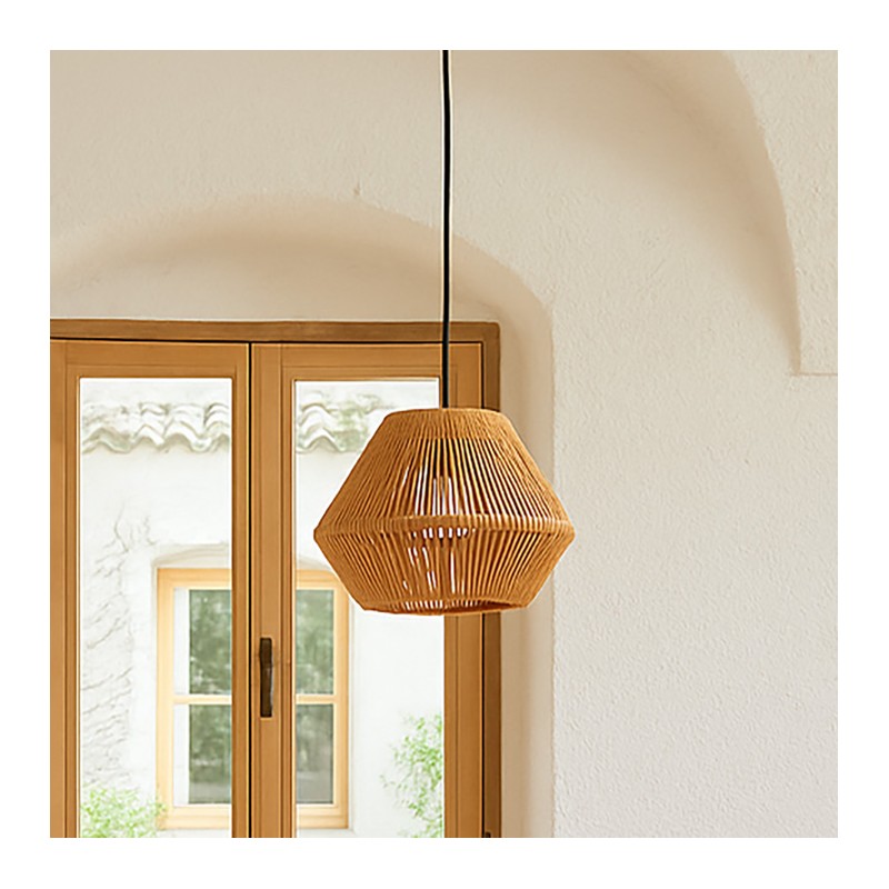 Pensada para comedores, salones o dormitorios, proporciona una luz envolvente de acento, ideal para crear atmósferas acogedoras. El uso de materiales naturales como la cuerda de cáñamo aporta textura y calidez, favoreciendo su integración en interiores de estilo bohemio, mediterráneo o nórdico.