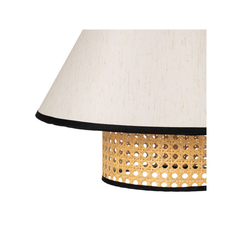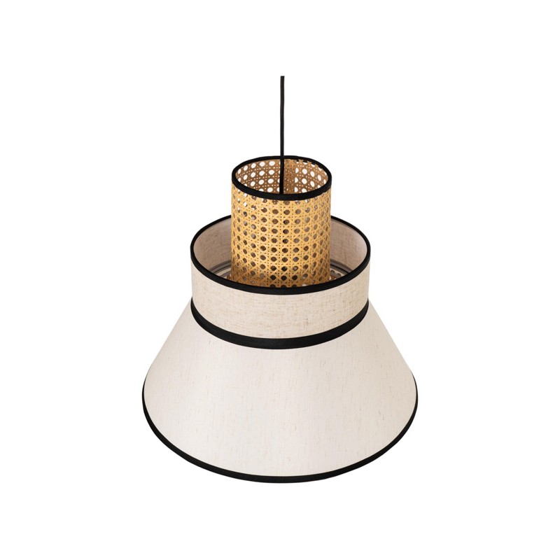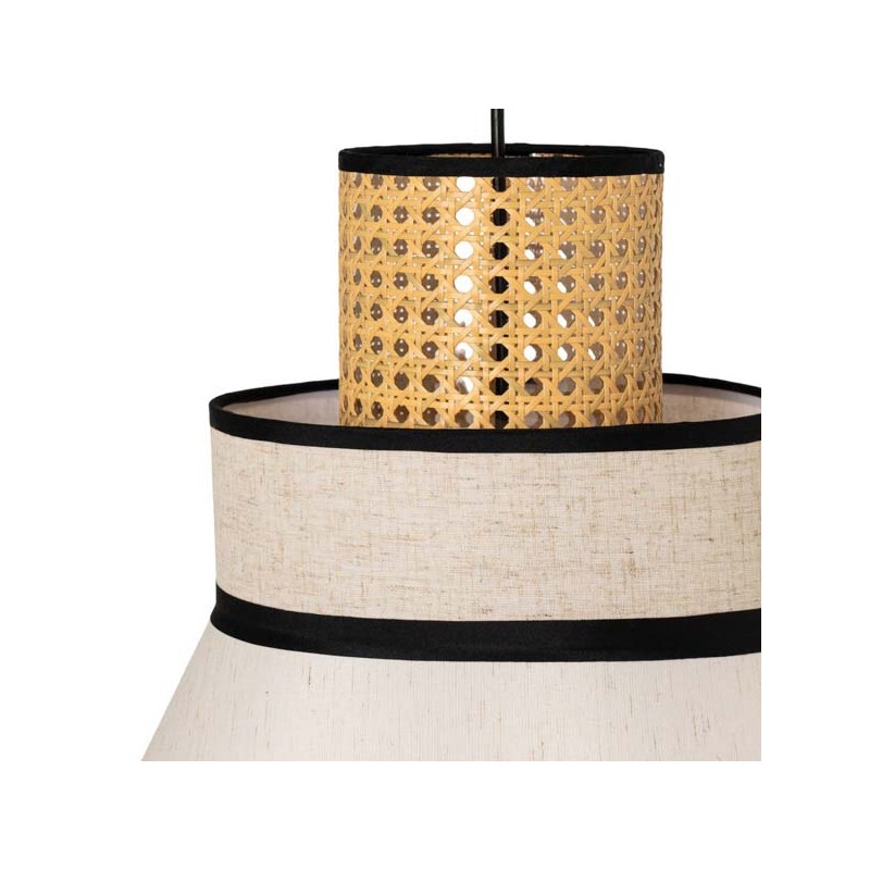 Esta lámpara colgante proporciona una iluminación suave gracias a la combinación de ratán calado y tejido en color claro, permitiendo el paso tamizado de la luz. La inclusión de detalles en negro en los bordes genera contraste y estructura visual, adaptándose especialmente bien a interiores de inspiración boho, mediterránea o nórdica.