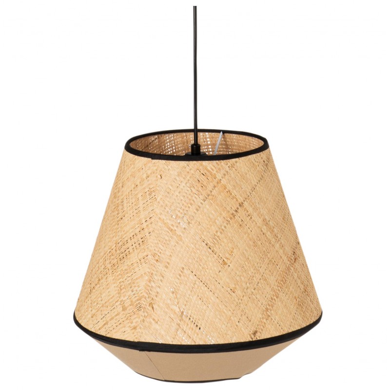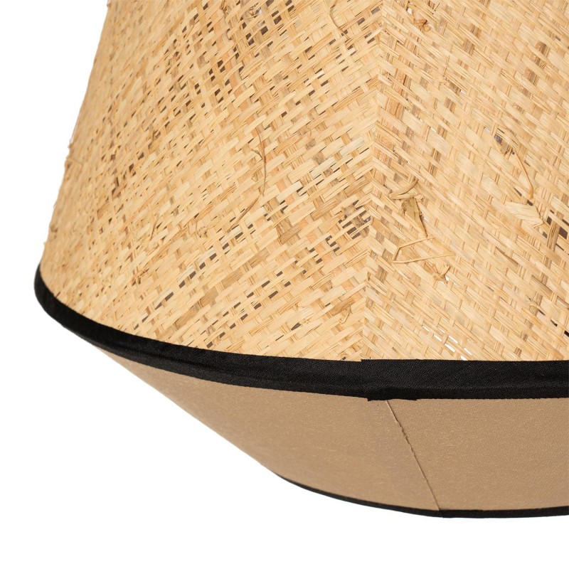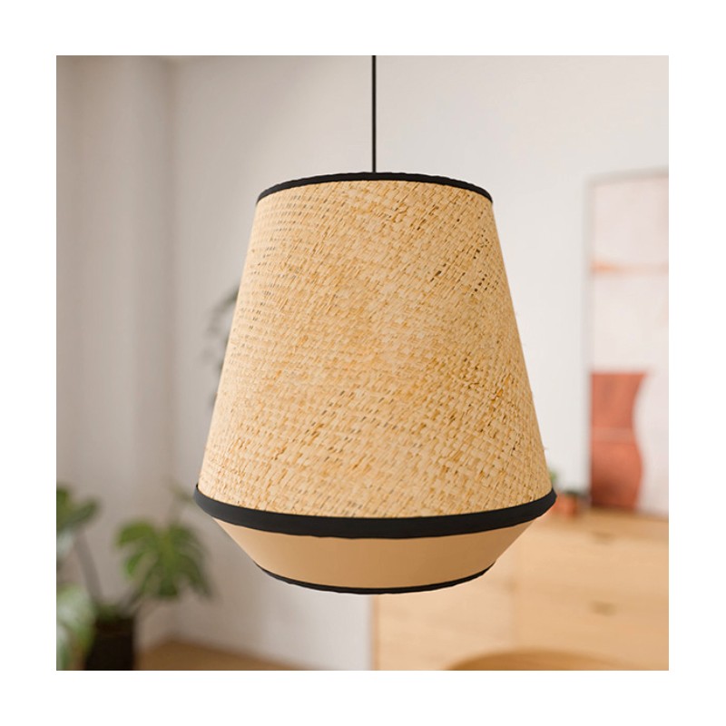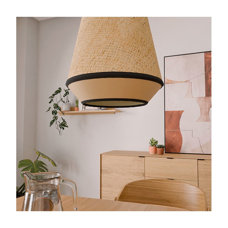 La lámpara de techo PINET destaca por su diseño cálido y artesanal, ideal para quienes buscan una iluminación con personalidad boho o rústica. Su pantalla combina fibra natural trenzada con una base de tela en tono beige, rematada con ribetes negros que aportan un sutil contraste elegante.