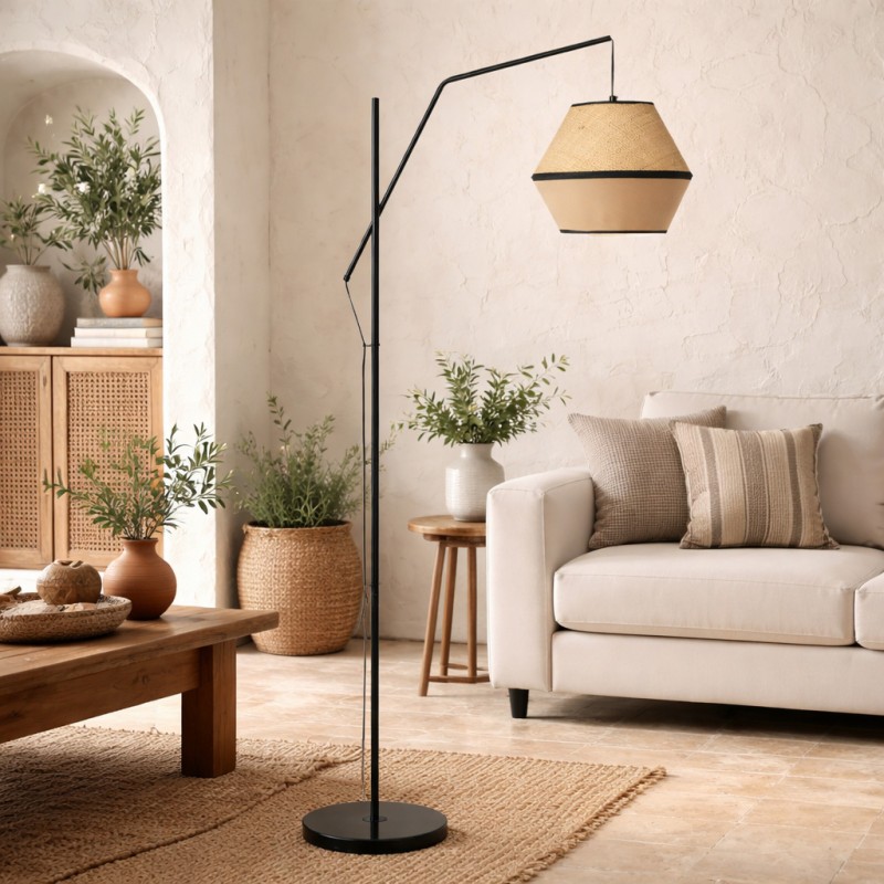 Su pantalla combina fibra natural trenzada y tela, proyectando una luz suave y acogedora que resulta especialmente adecuada para rincones de lectura, salones o dormitorios.