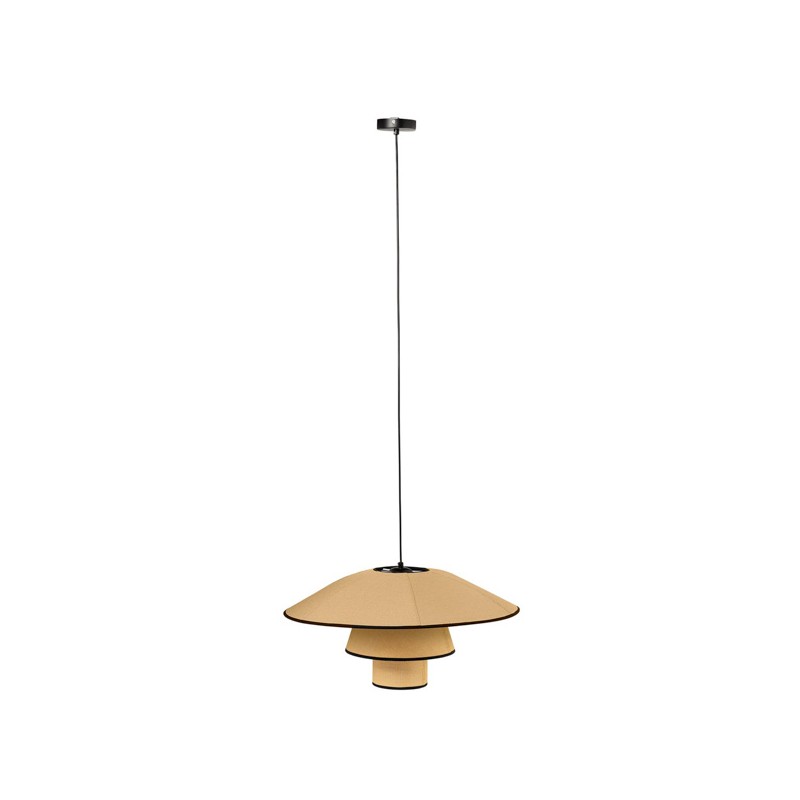 Su pantalla en forma escalonada, elaborada en rejilla de ratán, genera una silueta envolvente que aporta dinamismo sin perder ligereza visual.