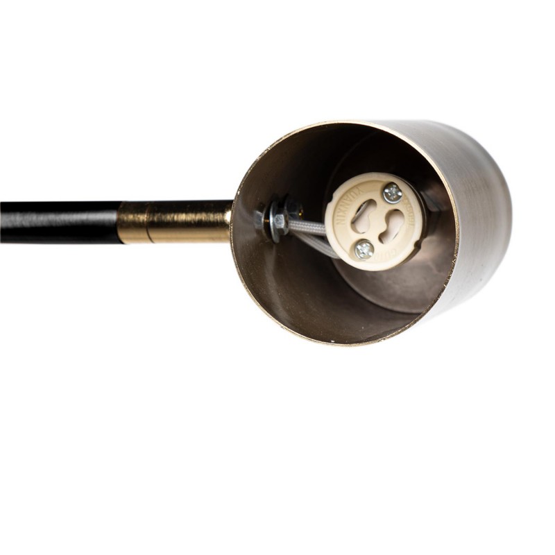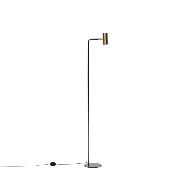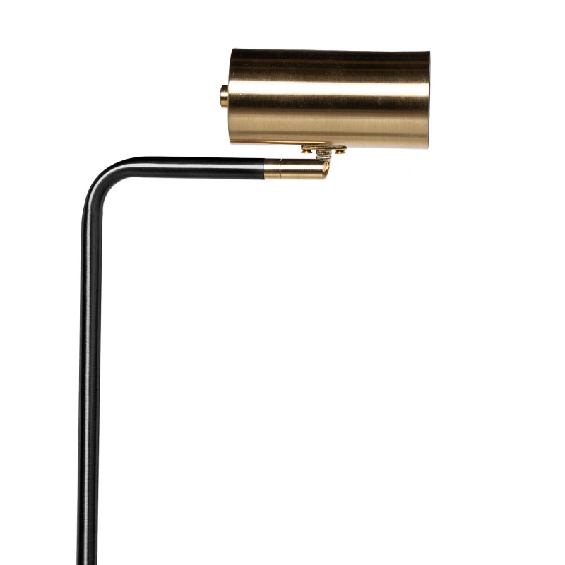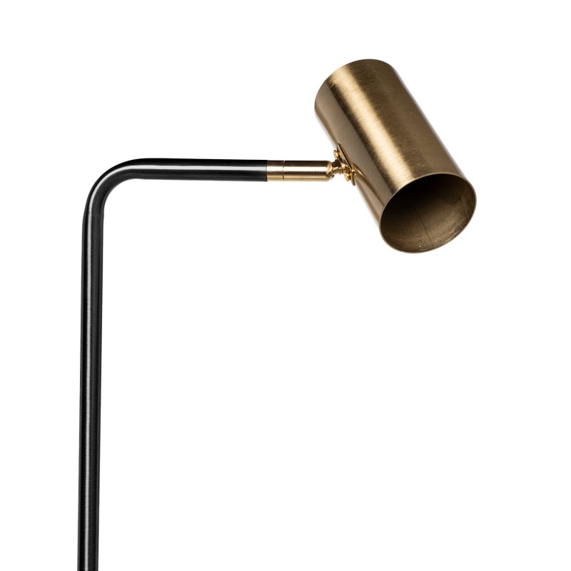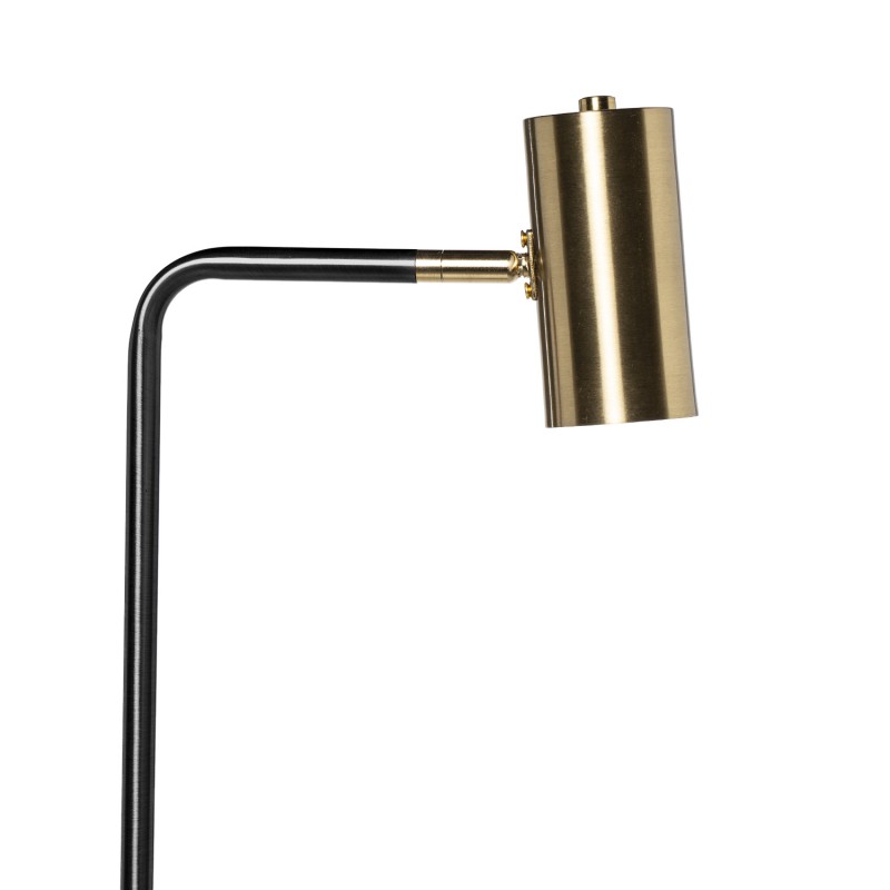 Su pantalla cilíndrica en acabado dorado contrasta con la estructura metálica negra, ofreciendo una pieza decorativa funcional y refinada.