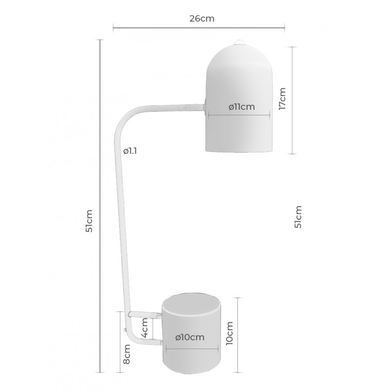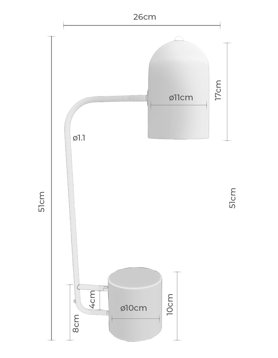 La lámpara tiene una altura de 59 cm., un ancho de 29 cm. y un fondo de 13,5 cm. La pantalla tiene un diámetro de 13,5 cm. y un largo de 17 cm. La base tiene un diámetro de 10 cm. El brazo tiene una longitud de 9 cm. Su peso es de 2,5 kg. El cable mide 150 cm. El resto de medidas puede consultarlas en el gráfico que aparece debajo y también en las fotografías.