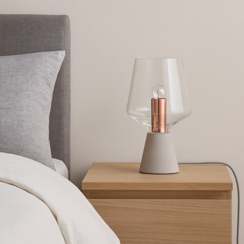 La lámpara de sobremesa AINA destaca por su combinación de materiales contrastantes que logran una estética equilibrada y contemporánea. Su base de cemento gris mate aporta un aire natural y robusto, mientras que la pantalla de vidrio translúcido suaviza la luz, creando un efecto envolvente y delicado.