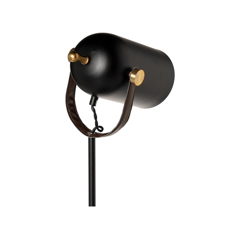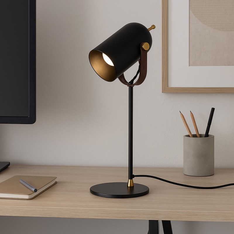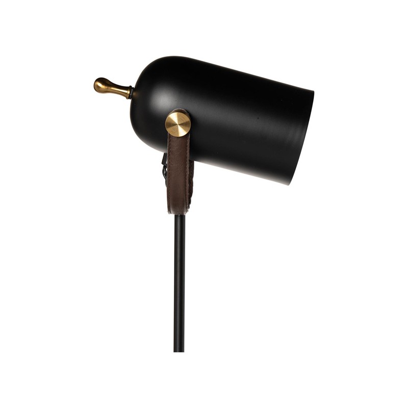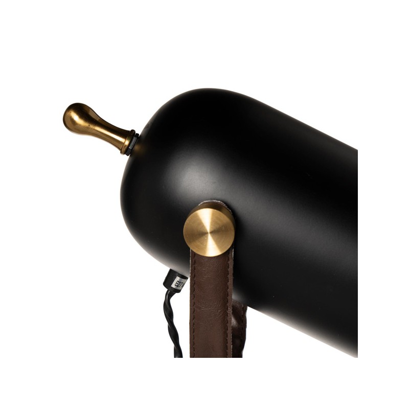 La lámpara de sobremesa LLUC destaca por su estética industrial con acabados elegantes. Su estructura metálica negra se complementa con una correa decorativa en polipiel marrón oscuro y remates metálicos en tono latón envejecido que aportan contraste visual y carácter.