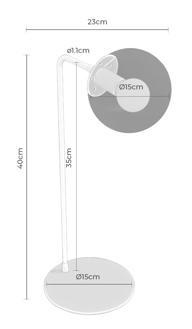 La lámpara tiene una altura de 52 cm., un ancho de 29 cm. y un fondo de 20 cm. La pantalla tiene un diámetro de 15 cm. y un largo de 16 cm. La medida del brazo es de 8 cm. La base tiene un diámetro de 15 cm. Su peso es de 1,7 kg. El cable mide 150 cm.