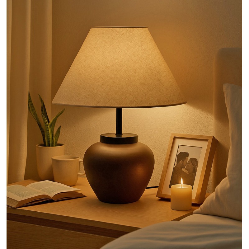 Su base de cerámica esmaltada en color oscuro proporciona estabilidad y una textura visual que contrasta con la suavidad de la pantalla de tela, creando un conjunto equilibrado y armónico.