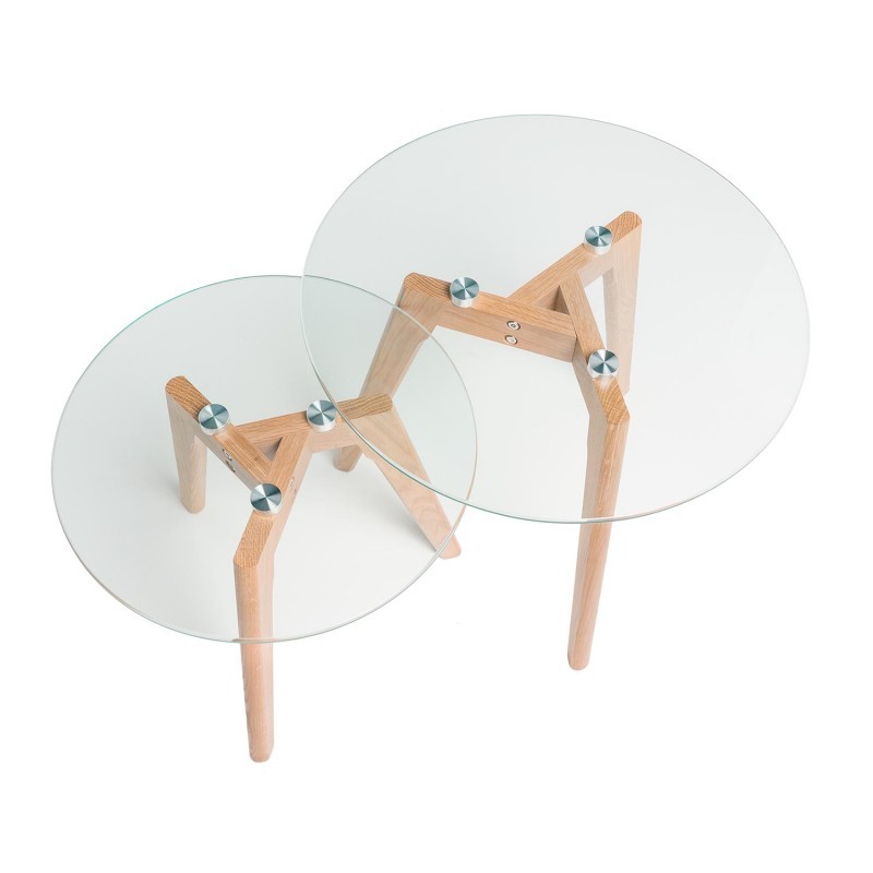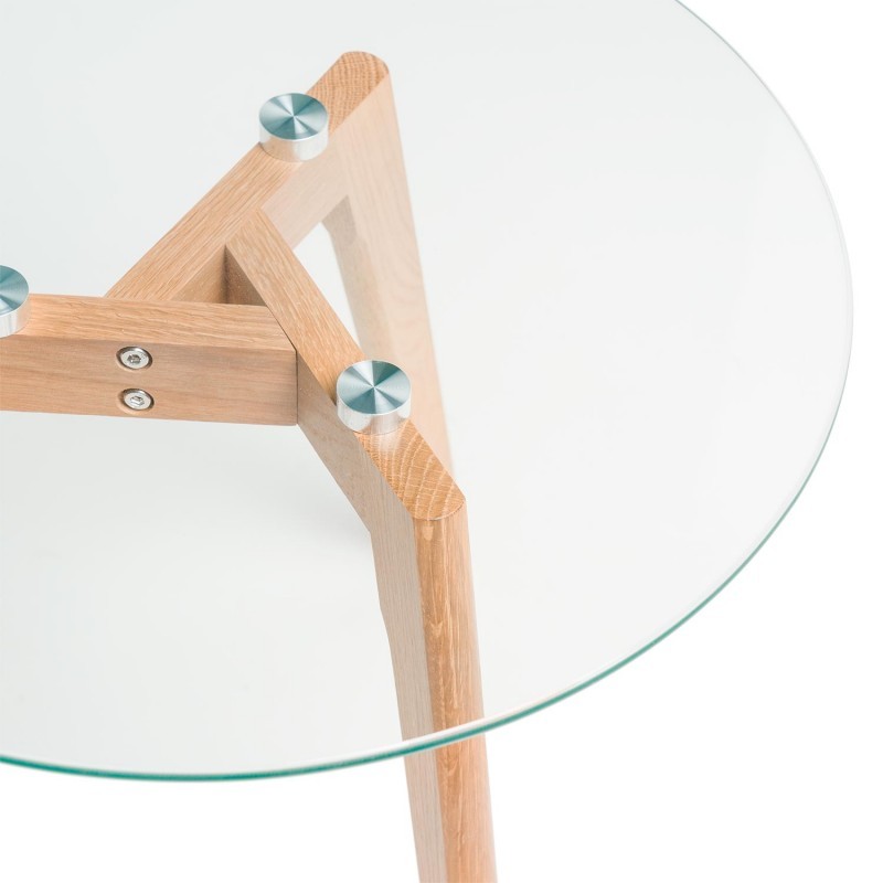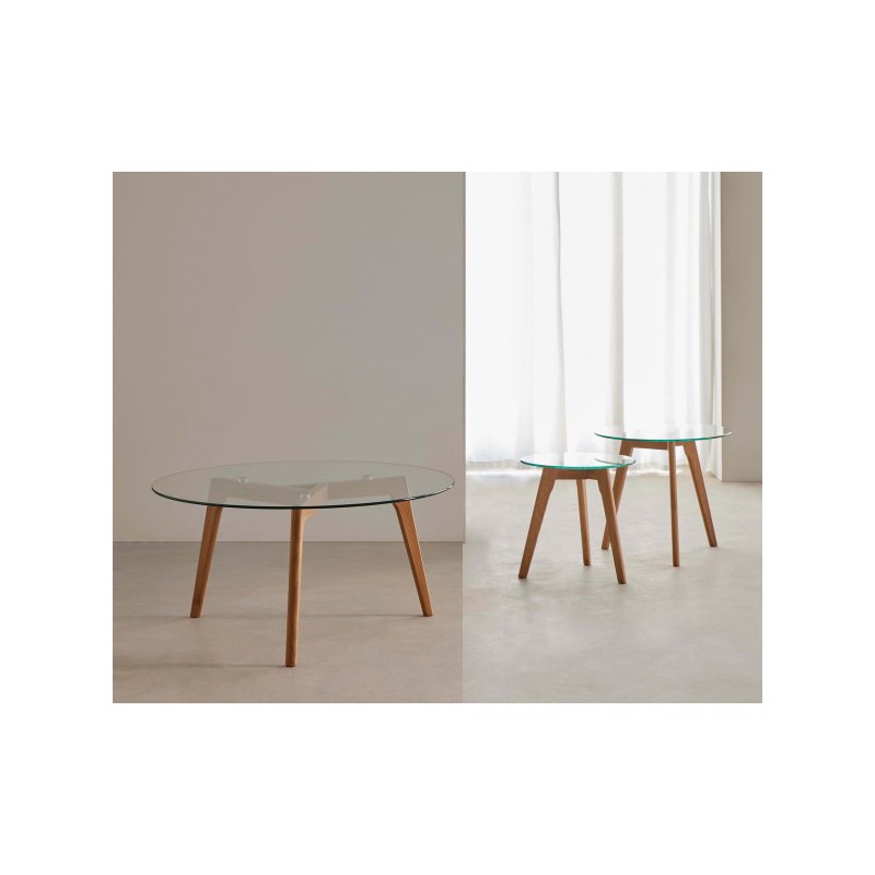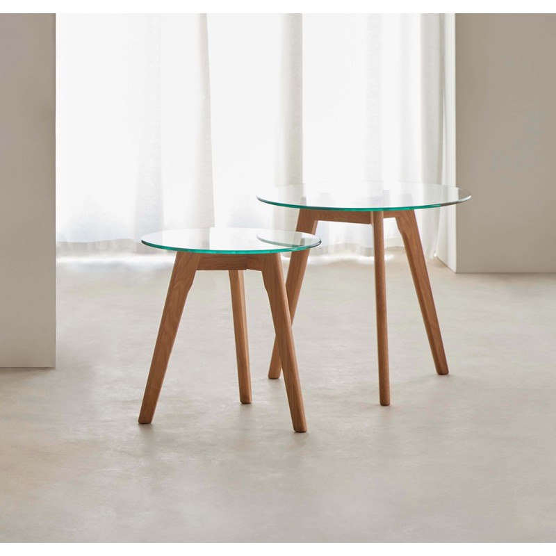 Cada mesa cuenta con una estructura firme de patas en acabado roble, que aporta calidez y estabilidad, mientras que el cristal transparente deja pasar la luz, ayudando a que el espacio se sienta más amplio y luminoso.