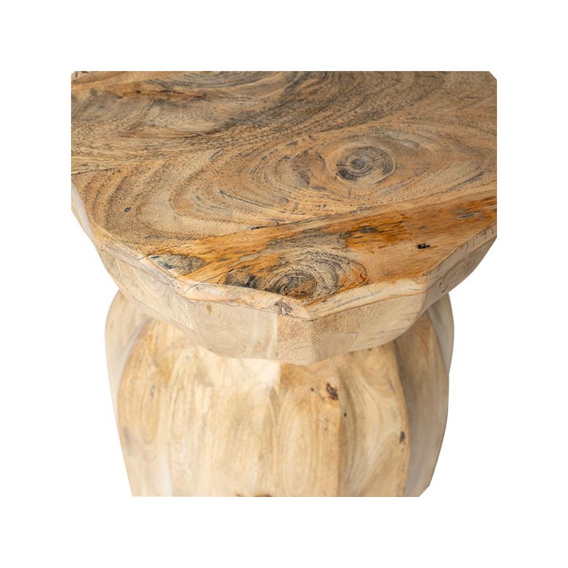 La mesa auxiliar ARJUN está tallada en madera maciza de mango, lo que le confiere una presencia cálida y orgánica, perfecta para ambientes que buscan un estilo natural con carácter. Cada pieza se distingue por las vetas, nudos y matices únicos del material.
