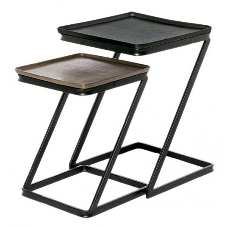 Conjunto de mesitas auxiliares NIHAL de estilo indio. Las mesitas están realizadas con tapas cuadradas de aluminio en tono negro y en tono cobre. El diseño de las patas de hierro son un detalle que convierten al conjunto en único y elegante.