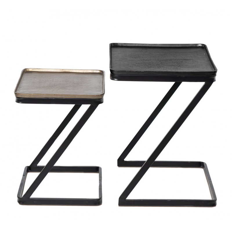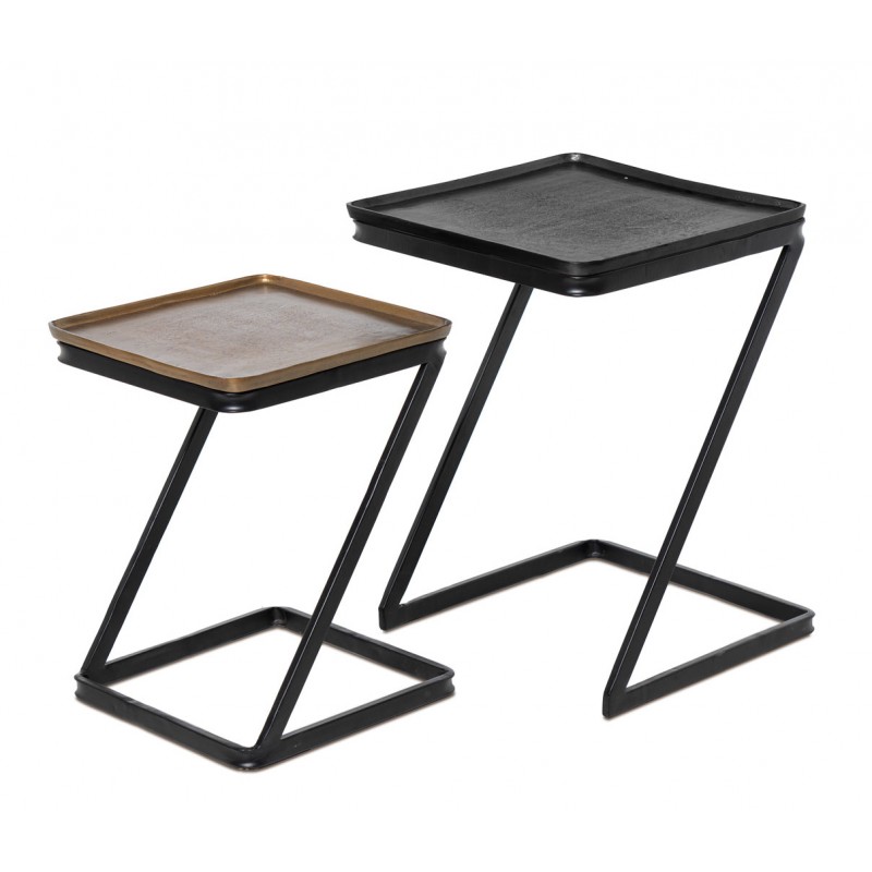 Set de mesas auxiliares NIHAL, formado por dos piezas cuadradas de diferentes alturas, diseñado para aportar funcionalidad y diseño gráfico a espacios interiores. Su estructura en líneas diagonales y superficies metálicas define una estética marcada, ideal para ambientes urbanos o decoraciones con carácter.