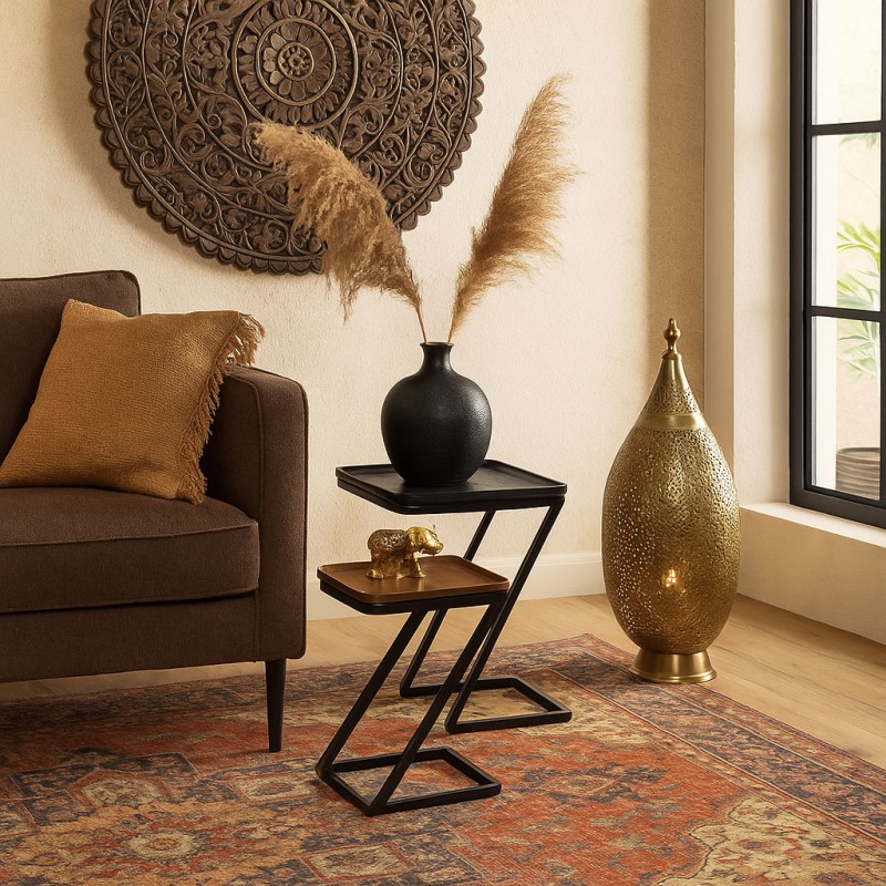 El set de mesas auxiliares NIHAL destaca por su diseño escultórico, que juega con el equilibrio visual y las proporciones asimétricas. La mezcla de materiales metálicos en tonos oscuros y bronce envejecido se adapta especialmente bien a estilos industriales, modernos o eclécticos, donde el metal es protagonista.
