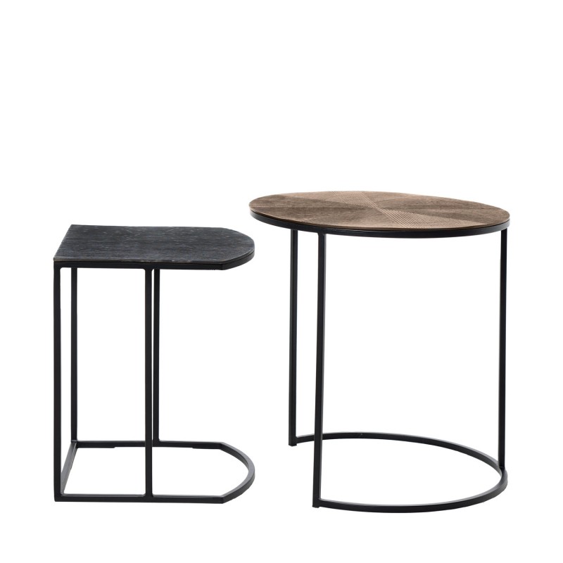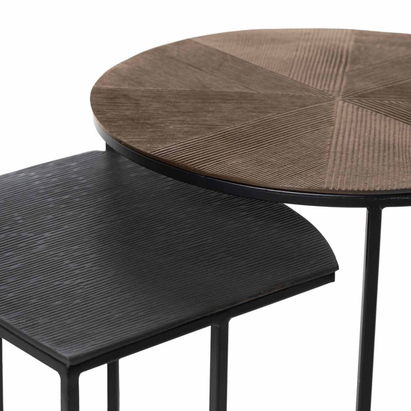 La estructura metálica negra de las patas ofrece un contraste elegante con los tonos oscuros y cálidos de las superficies. El conjunto resulta versátil y ligero visualmente, ideal para complementar sofás o rincones especiales del hogar con un toque artístico y funcional.
