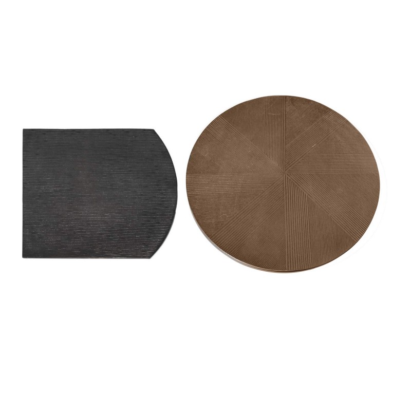 Las tapas están elaboradas en aluminio en tono negro y en tono cobre con relieve texturizado, lo que aporta profundidad, sofisticación y un sutil efecto visual. Estos acabados pueden mostrar pequeñas imperfecciones propias del trabajo manual, lo que convierte cada pieza en única e irrepetible.