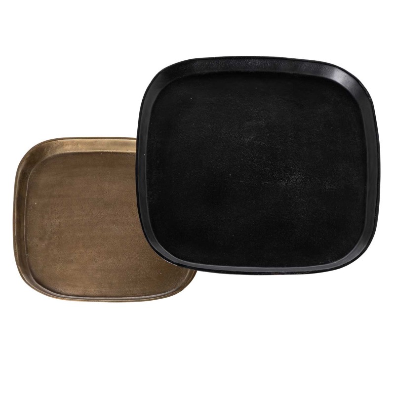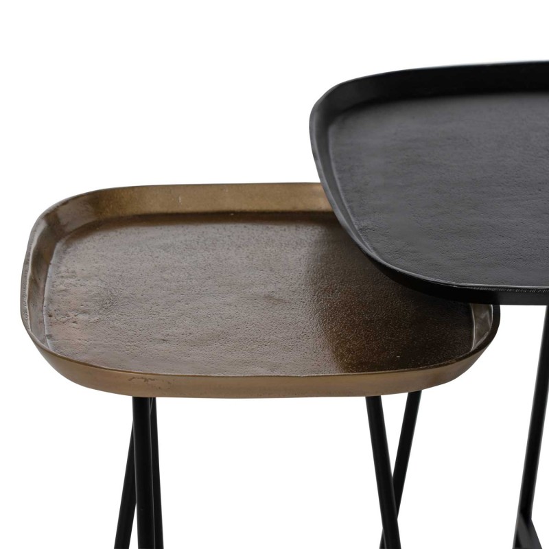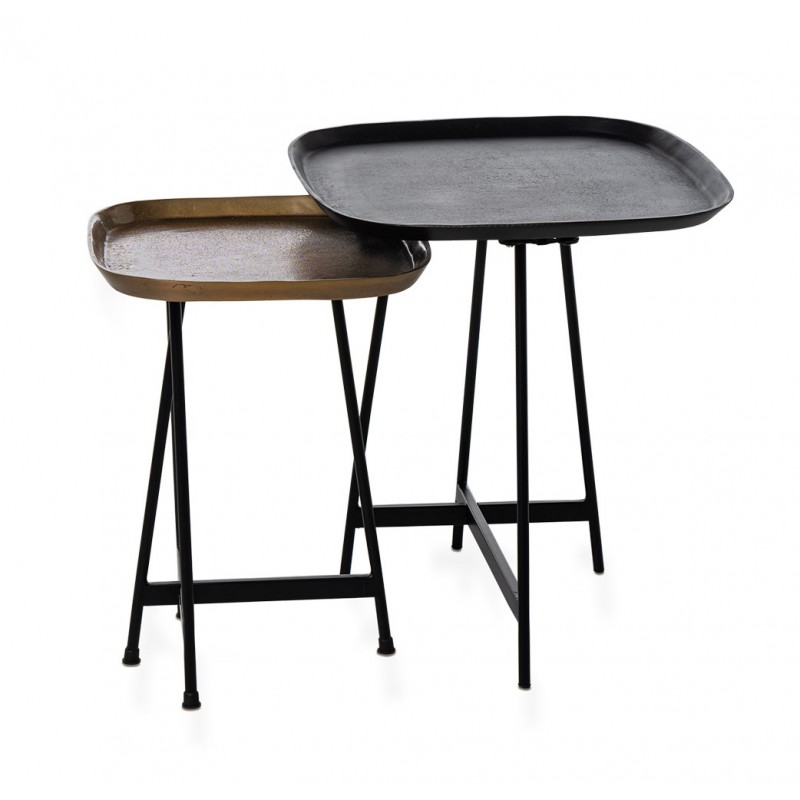 Gracias a su contraste de colores —una en tono bronce y otra en negro— este set de mesas auxiliares AMIR añade un atractivo visual moderno y sofisticado. Las formas suaves de sus bandejas superiores y los sutiles relieves capturan la luz de forma natural, aportando calidez y dinamismo a la decoración.
