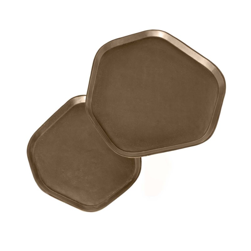 Las tapas, de formas orgánicas y superficie irregular, aportan una estética escultórica sin perder practicidad. El acabado en tono cobre envejecido introduce calidez visual, mientras que las patas metálicas negras estilizan la silueta y refuerzan la estabilidad estructural.