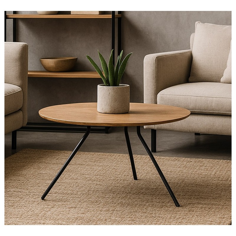 Mesitas BRIAN y DAVID de formas redondas fabricadas con MDF (Fibra de Densidad Media) de 18 mm. de grosor y chapa natural de roble y roble tintada en negro y las patas de acero negro.
