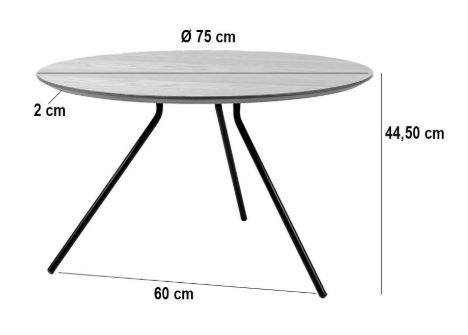 El diámetro de la mesita BRIAN es de 60 cm. y la altura es de 40 cm. y el diámetro de la mesita DAVID es de 75 cm. y la altura es de 45 cm. Los pesos son 3,5 y 6,5 kg. respectivamente.