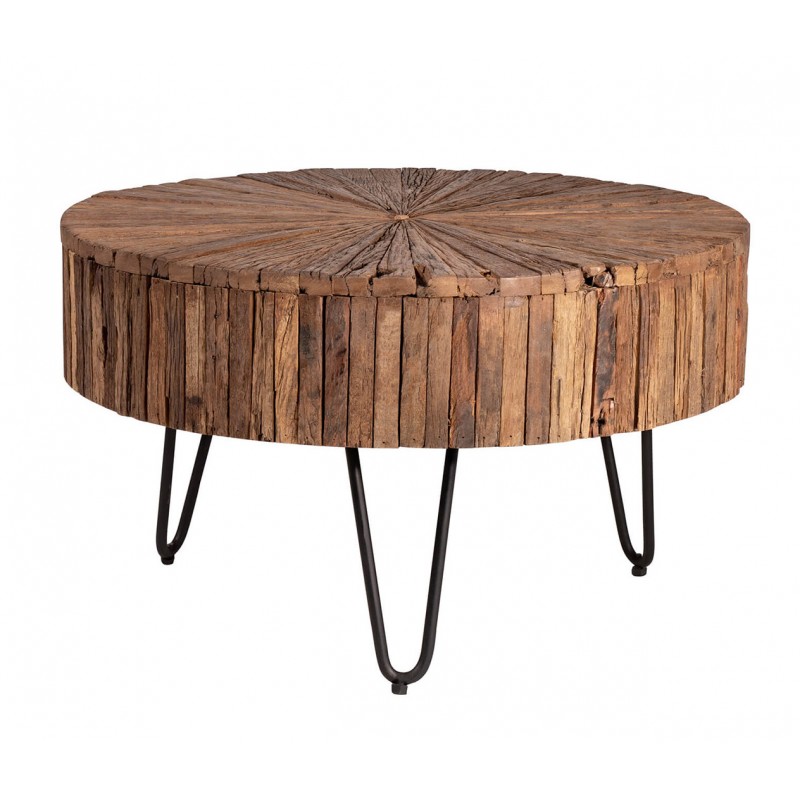 La mesa de centro TARAK es una mesa de centro redonda diseñada para salones que buscan un estilo natural con carácter. Su tapa de madera reciclada aporta textura y autenticidad, combinada con patas de hierro que refuerzan su estética.