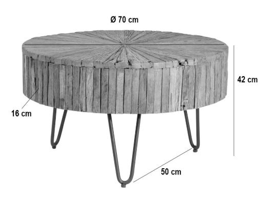 Su formato redondo facilita el movimiento alrededor del sofá y la hace práctica como apoyo para bebidas, libros o elementos decorativos. Funciona bien en zonas de estar con sofás de 2 o 3 plazas, especialmente en composiciones abiertas. Frente a mesas más ligeras, su tapa gruesa de 16 cm ofrece una mayor sensación de solidez. Las patas de hierro aportan estabilidad en el uso diario, mientras que la superficie de madera reciclada muestra variaciones únicas que la diferencian de opciones más uniformes. Encaja en ambientes industriales, boho o eclécticos.