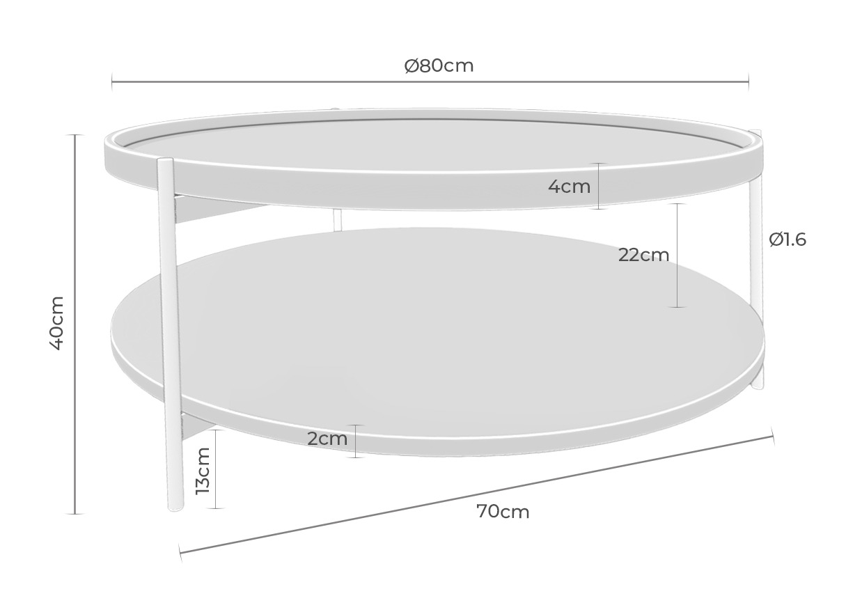 Tiene un diámetro de 80 cm. y una altura de 40 cm. El grosor de la tapa es de 18 mm. con un grosor en el canto de 40 mm. Su peso es de 18 kg. El resto de medidas puede consultarlas en el gráfico que aparece debajo y también en las fotografías.