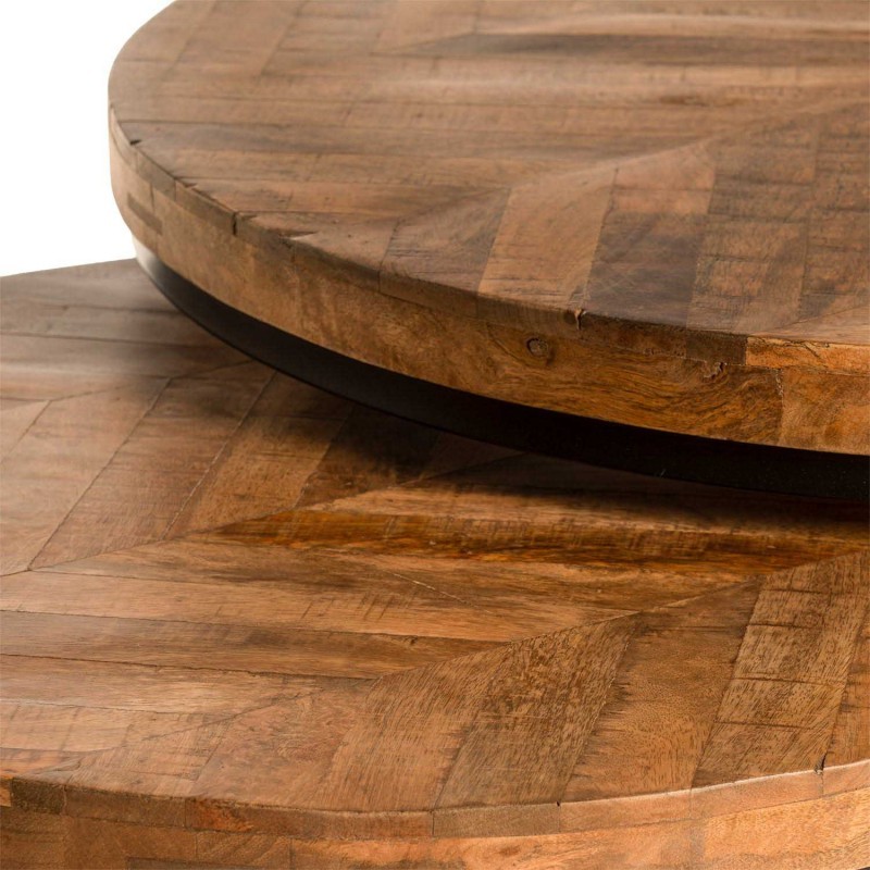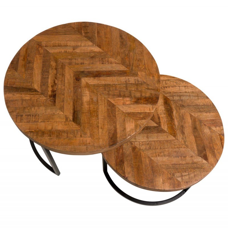 El set de mesas de centro FARLAN se compone de dos piezas redondas de diferentes alturas, diseñadas para funcionar en conjunto o por separado en zonas de estar. Combinan madera maciza de mango y estructura metálica negra, logrando un equilibrio entre rusticidad natural y estética contemporánea.