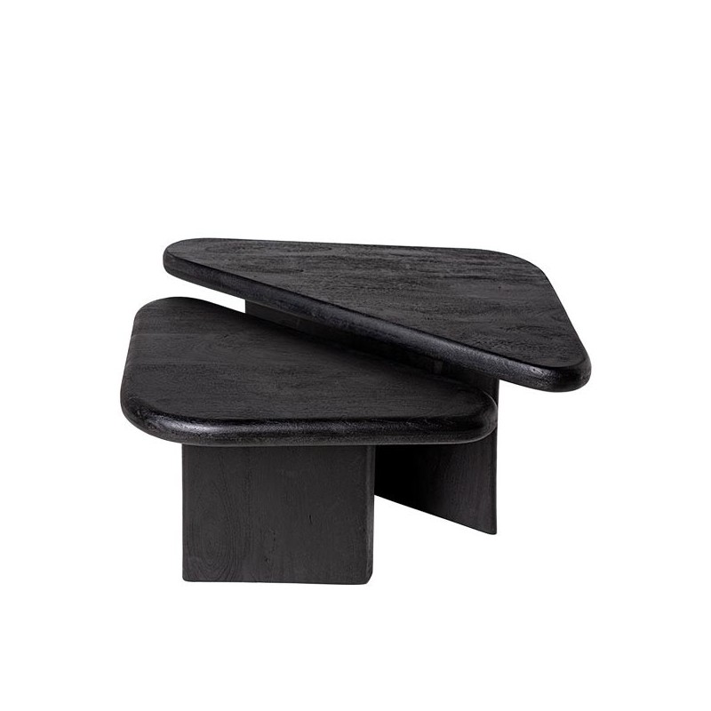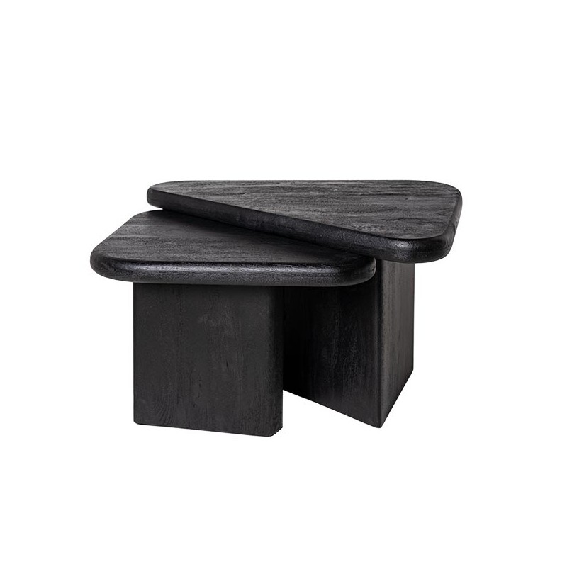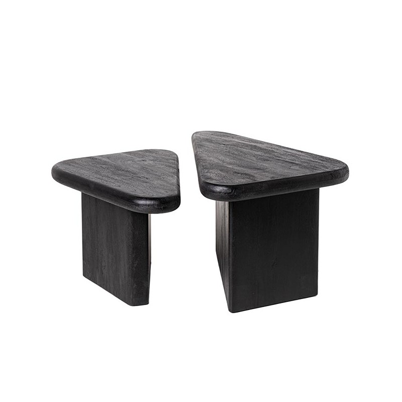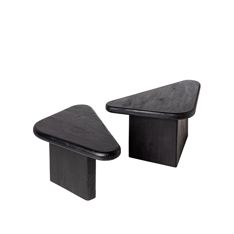 Fabricadas en madera maciza de mango, ambas mesas presentan un diseño geométrico de formas suaves que facilita su integración en espacios de inspiración natural o contemporánea.