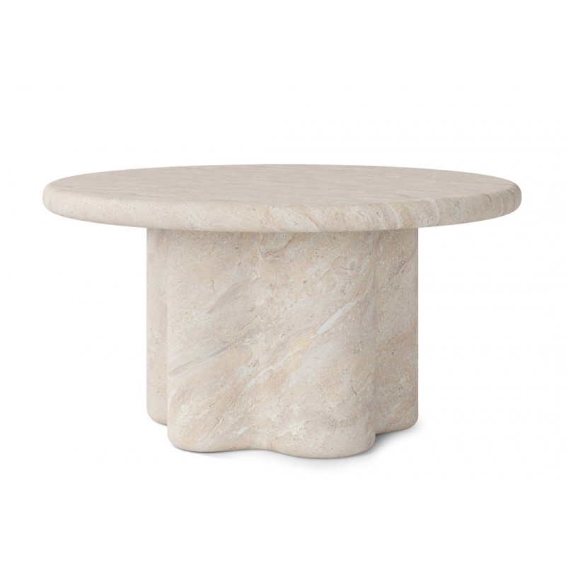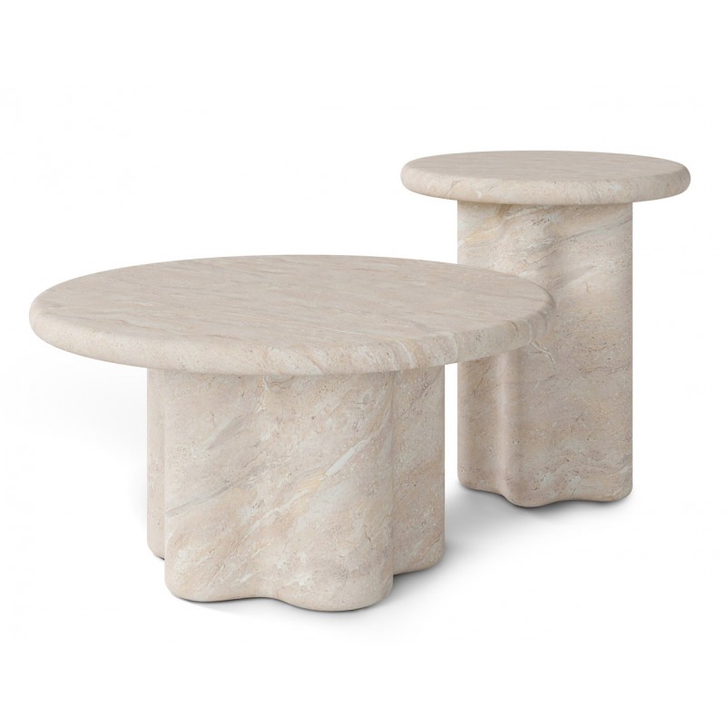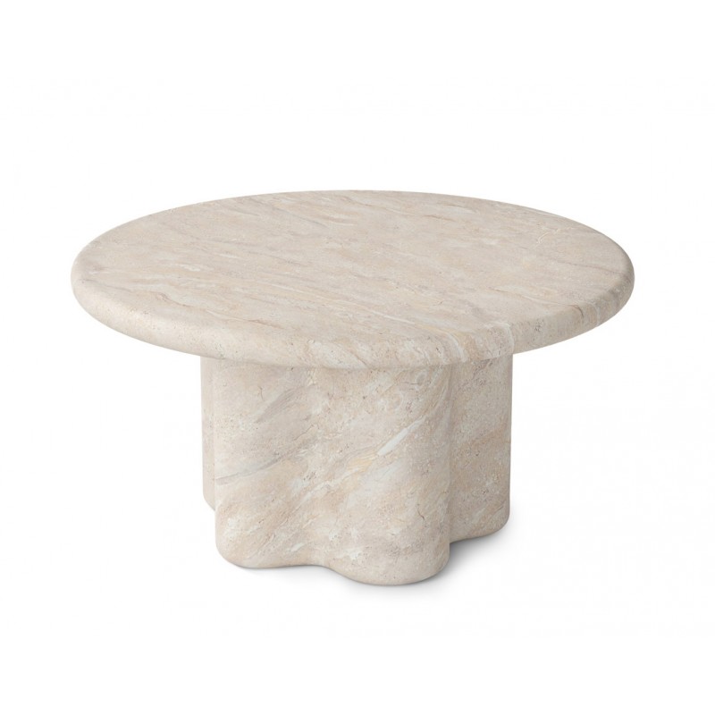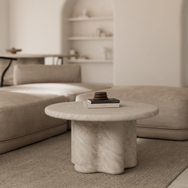 La mesa de centro LUIGI es una pieza fabricada en cemento GFRC (reforzado con fibra de vidrio) con acabado efecto mármol travertino. Su diseño combina una tapa circular de líneas suaves con una base escultórica de formas curvas, generando una presencia sólida y equilibrada.