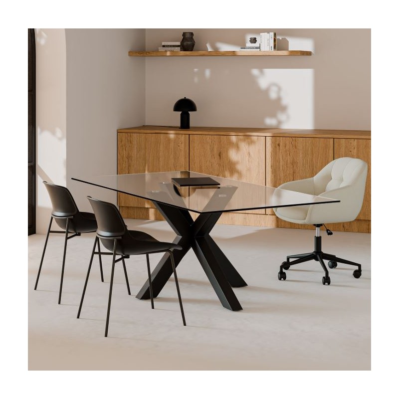 La mesa de comedor DEMI es una pieza de diseño imponente que destaca por su base escultórica y su elegancia atemporal. Su tapa de cristal templado de 12 mm aporta una sensación de amplitud y luminosidad, perfecta para ambientes modernos y sofisticados.