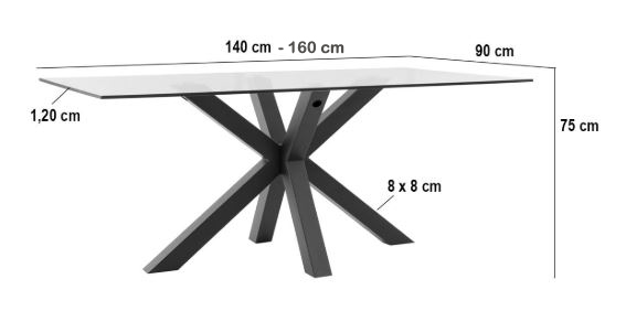 Disponible en varios tamaños, 140x90cm., 160x90cm. 180x100cm. y 200x100cm.. Tiene una altura de 75 cm. Su peso es de 48, 53, 64 y 70 kg. en función del tamaño y admite un peso de carga de 70 kg. El grosor de las patas es de 8 x 8 cm. El grosor de la tapa es de 12mm. El resto de medidas puede consultarlas en el gráfico que aparece debajo y también en las fotografías.