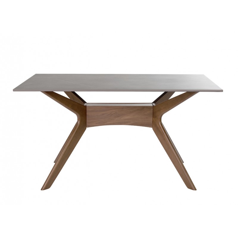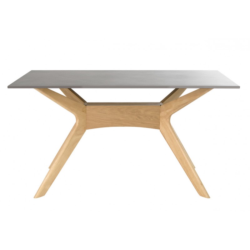 Las patas de madera maciza de hevea con acabado roble natural o nogal, brindan robustez estructural y un contraste armónico con la superficie. El diseño cruzado de la base destaca por su originalidad y estabilidad.