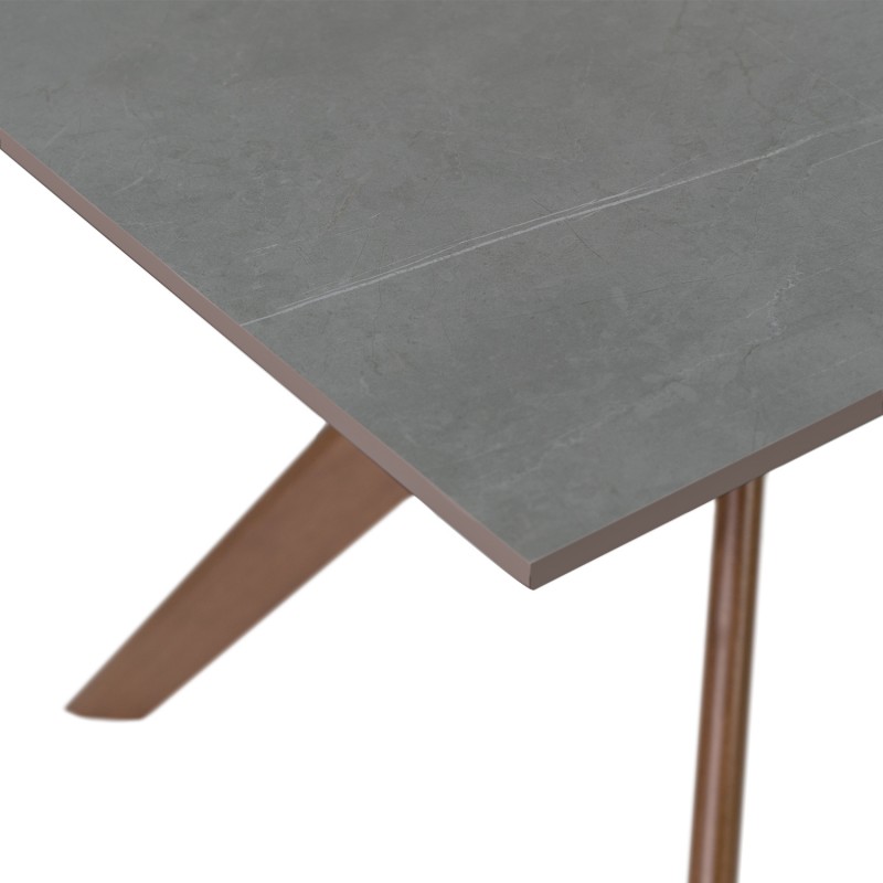 El porcelánico es un nuevo material supercompacto creado con materiales naturales sometidos a cocción que tiene unas características muy especiales como la resistencia al rayado, al calor, al fuego, a los productos químicos, etc., lo que lo hace especialmente interesante para la fabricación de mesas por su especial resistencia. Además, su superficie es muy higiénica. Los diferentes acabados se logran en el proceso de mezcla de los materiales consiguiendo el efecto marmoleado con sus vetas.
