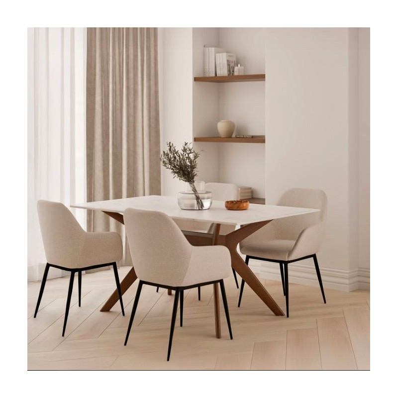 Combina una tapa de porcelánico con patas de madera, lo que la hace adecuada para quienes buscan una mesa resistente con una estética contemporánea. Encaja especialmente en interiores modernos, minimalistas o con influencia escandinava.