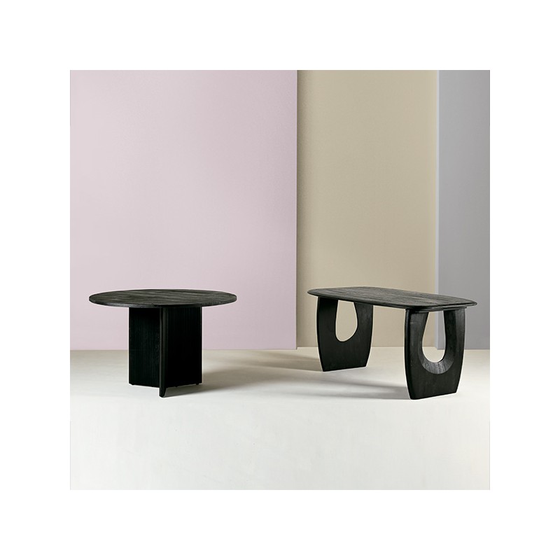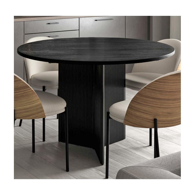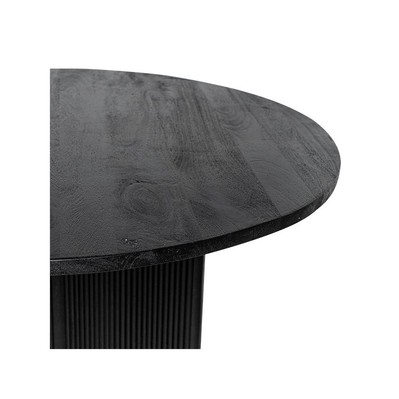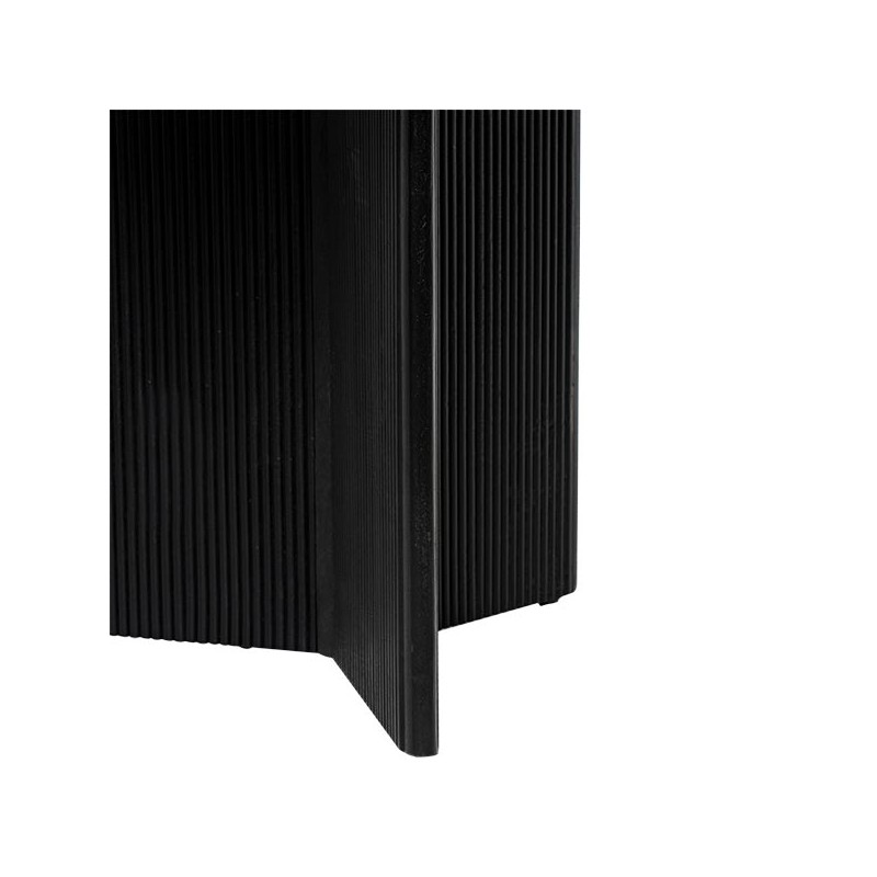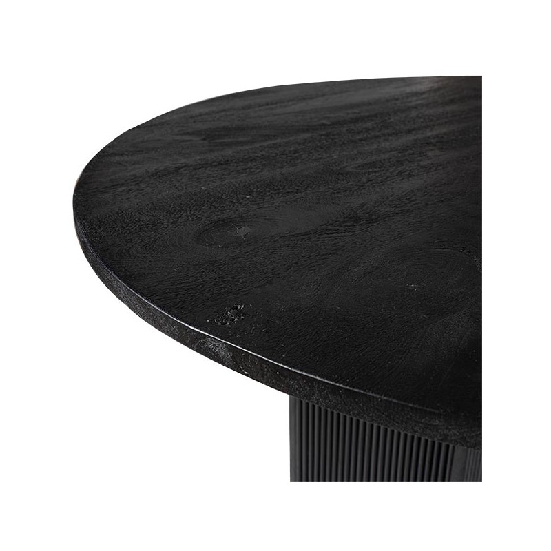 Fabricada en madera de mango con acabado negro, su superficie muestra una textura sutil y natural que resalta la calidad del material. La base central, con relieves verticales marcados, aporta profundidad y un punto focal visual distintivo.