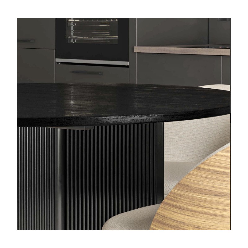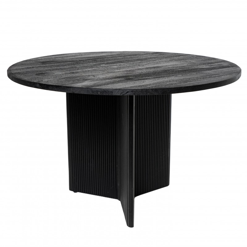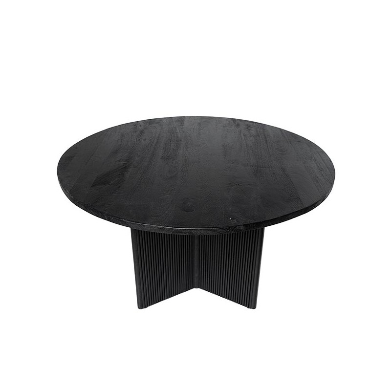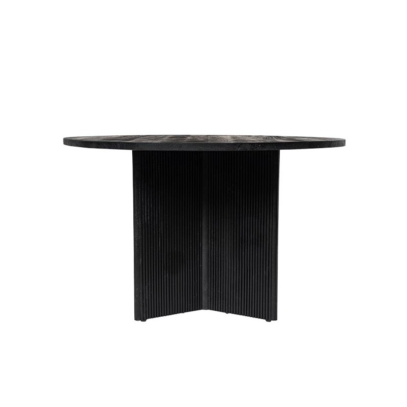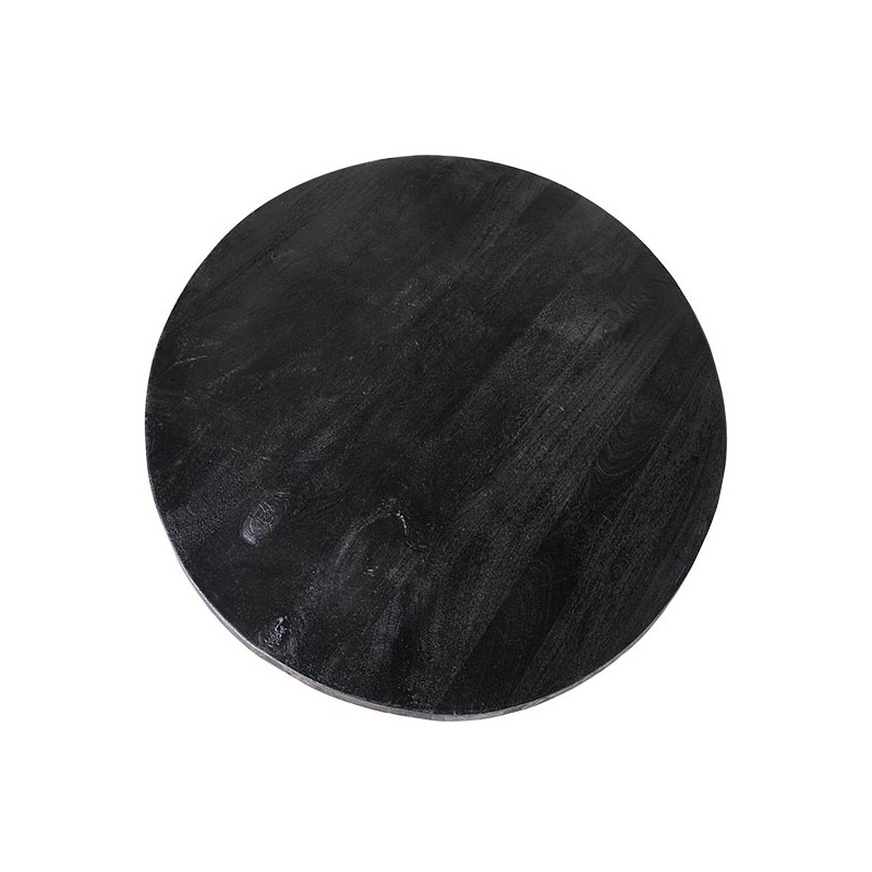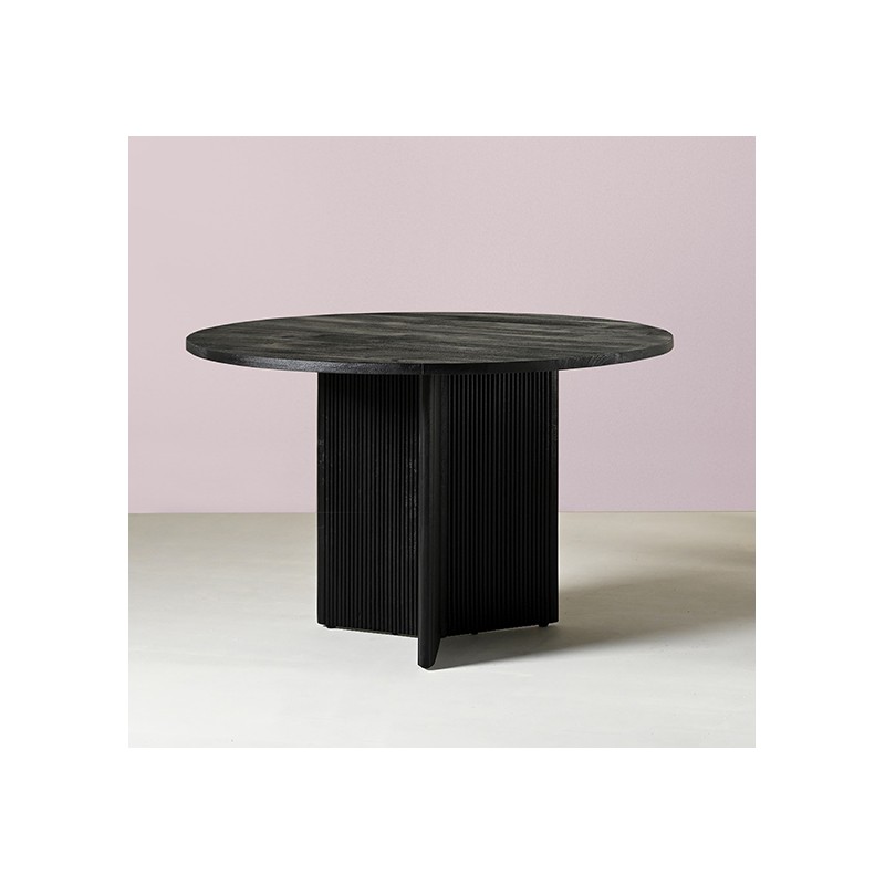 Fabricada en madera de mango con acabado negro, su superficie muestra una textura sutil y natural que resalta la calidad del material. La base central, con relieves verticales marcados, aporta profundidad y un punto focal visual distintivo.