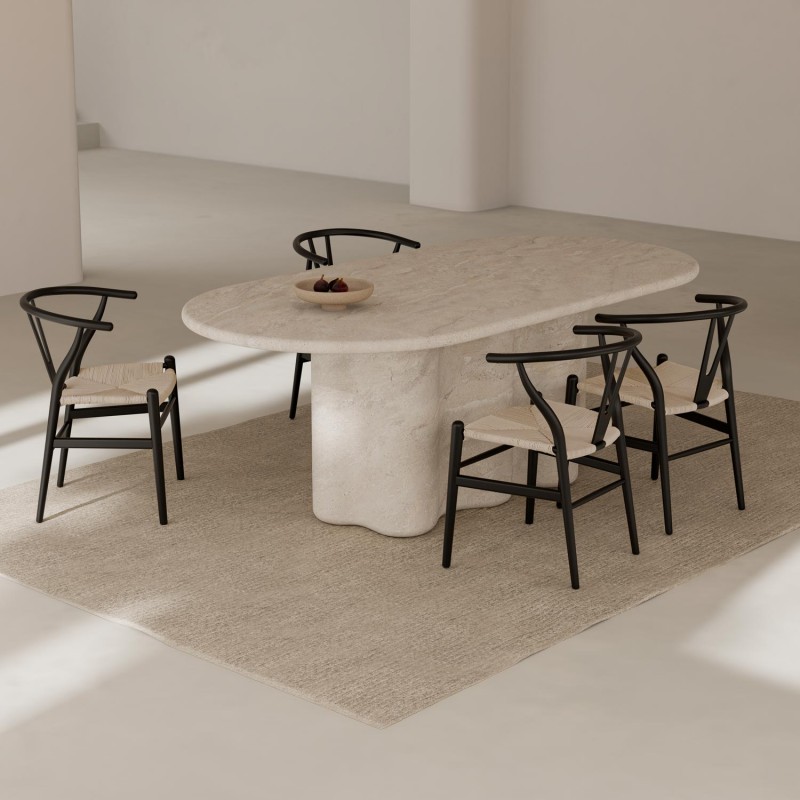 La mesa de comedor LORRAINE es una mesa de gran formato fabricada íntegramente en cemento-GFRC (reforzado con fibra de vidrio) con acabado efecto travertino. Su diseño escultórico y su presencia sólida la convierten en el eje central de comedores amplios y espacios abiertos.