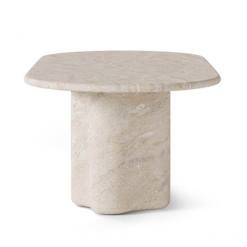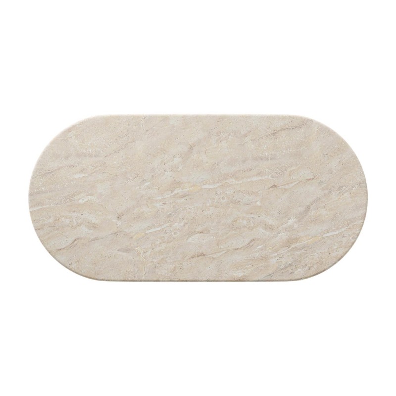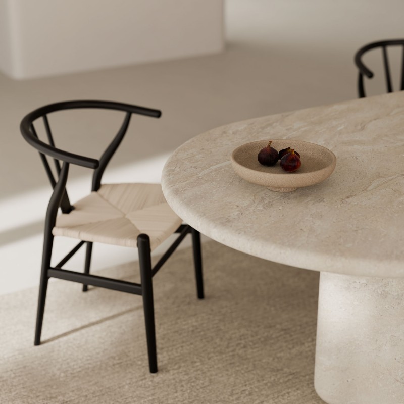 El acabado travertino aporta textura y profundidad, con vetas y ligeras variaciones de pigmentación, o poros visibles, propias del material, lo que refuerza su autenticidad. Puede combinarse con sillas de madera, metal o tapizadas, adaptándose a interiores contemporáneos, minimalistas o mediterráneos.