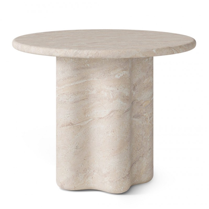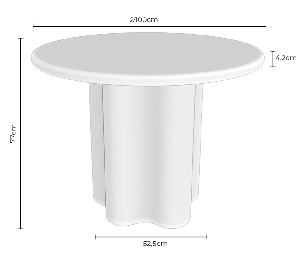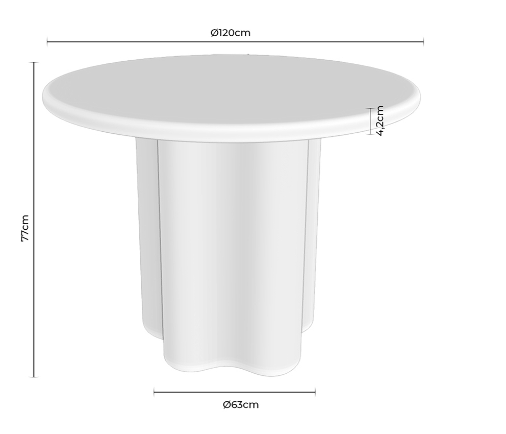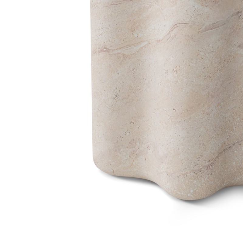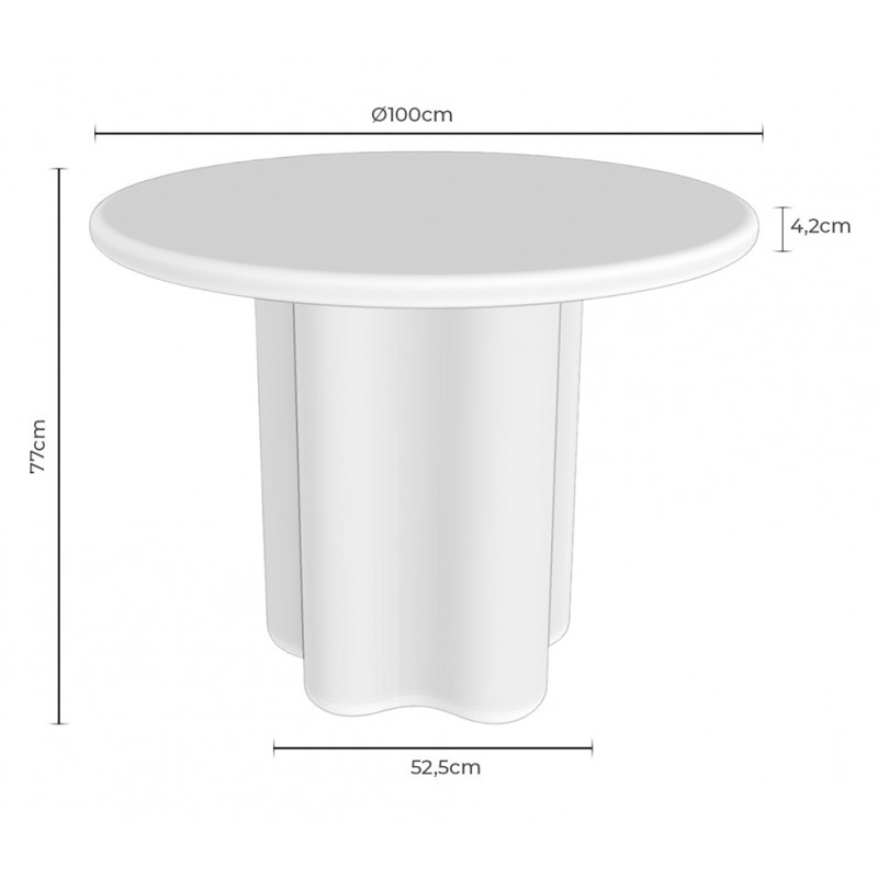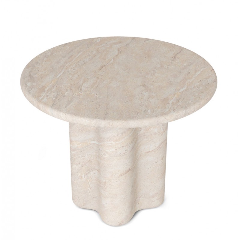 La mesa de comedor MICHELLE es una mesa redonda fabricada íntegramente en cemento GFRC reforzado con fibra de vidrio, con acabado efecto mármol travertino. Su diseño combina una tapa circular con una base escultórica de formas onduladas, aportando una estética orgánica y contemporánea.