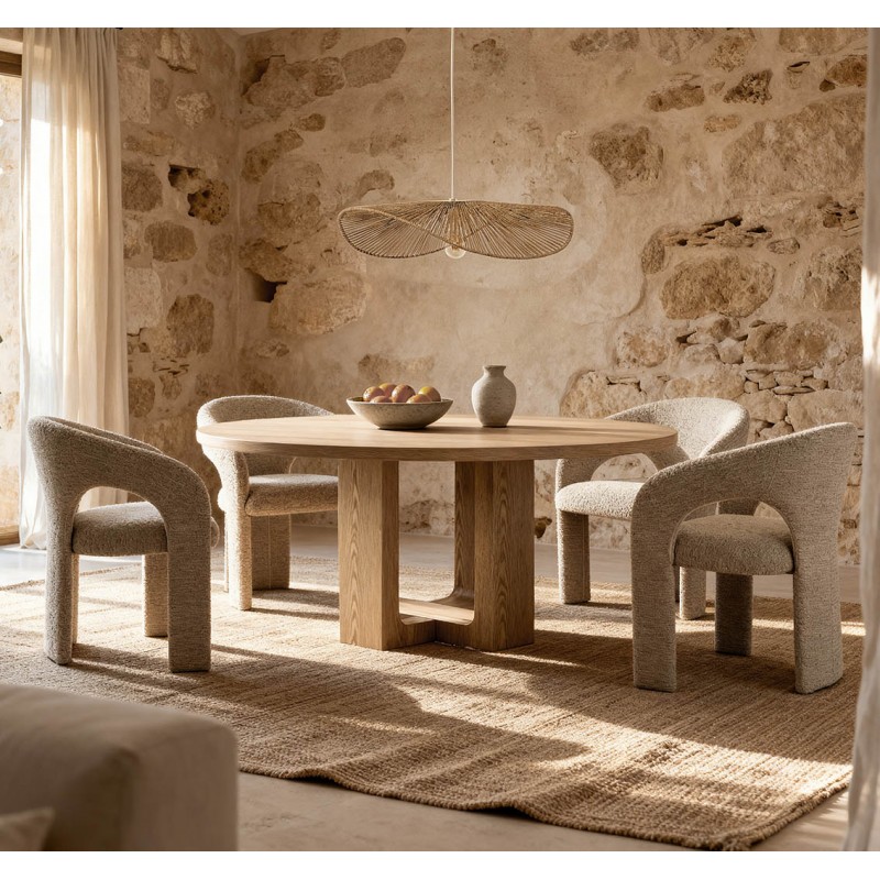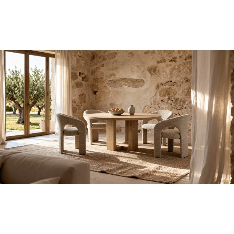 Gracias a su forma circular, la mesa de comedor MAXINE favorece la conversación y el uso diario en hogares que valoran un ambiente acogedor. Es una opción adecuada para 4 personas y encaja especialmente bien en estilos japandi o escandinavos.
