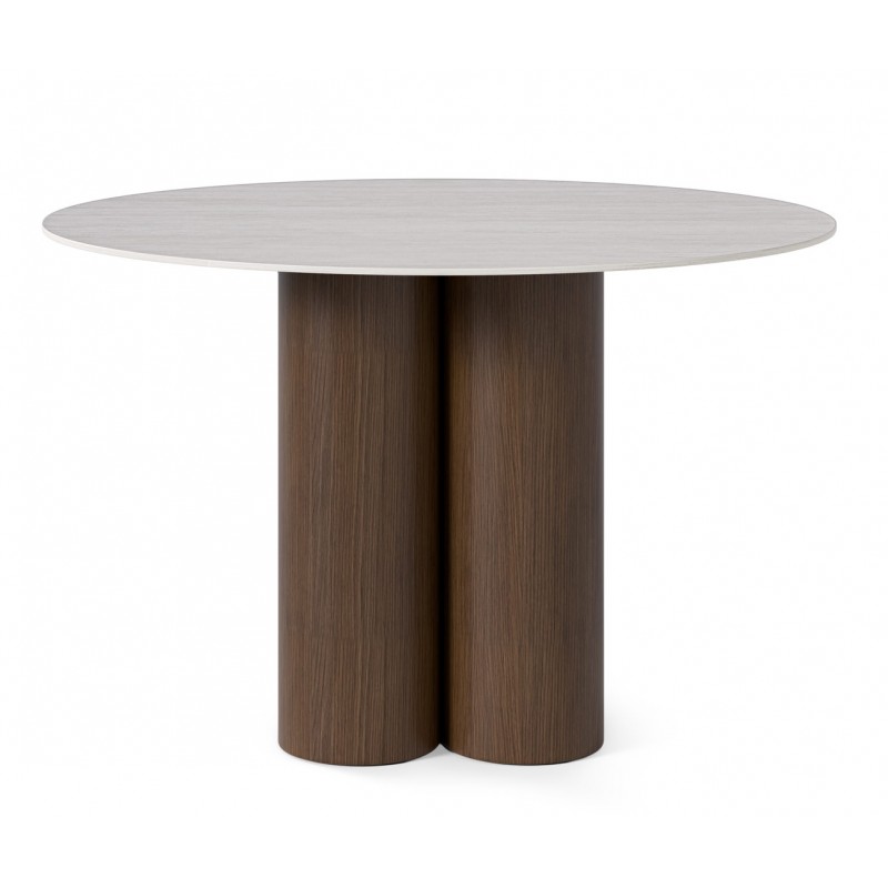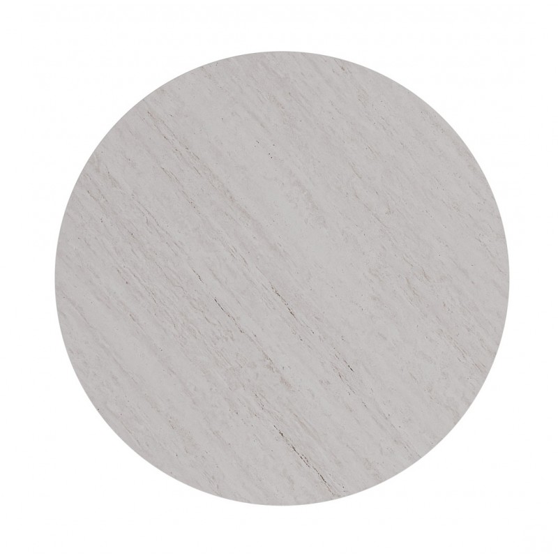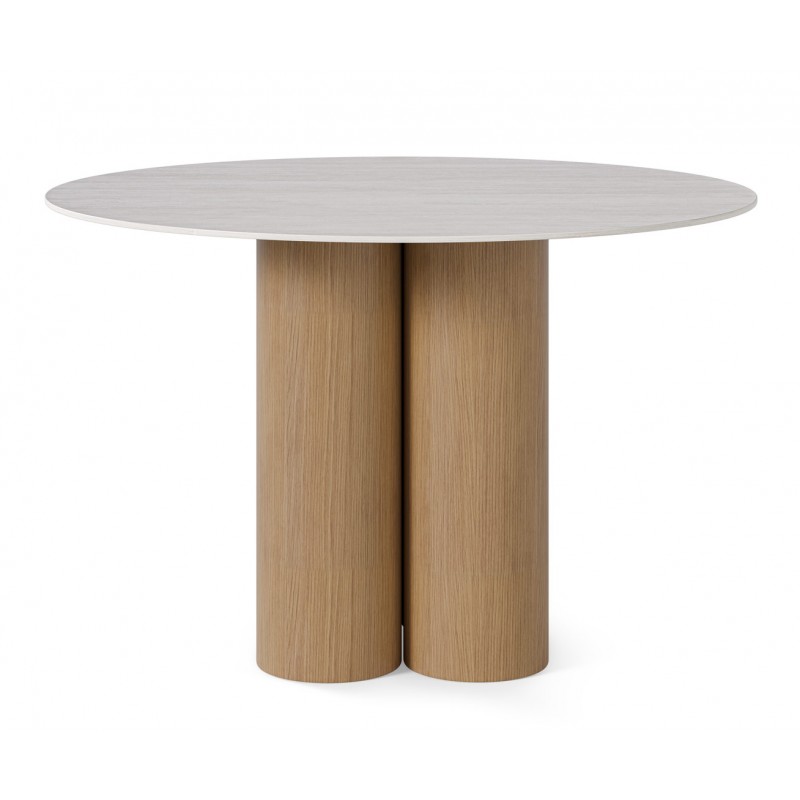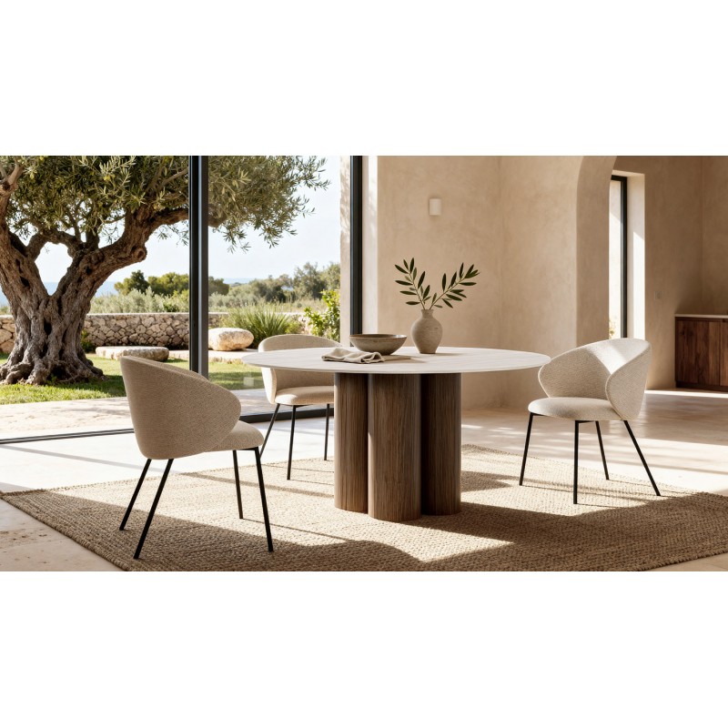 La tapa de porcelánico efecto travertino ofrece una superficie resistente al uso diario, más duradera frente a rayaduras o calor que otras opciones más ligeras. Su base de cuatro cilindros en madera aporta una estabilidad sólida y un diseño más escultórico frente a patas convencionales.