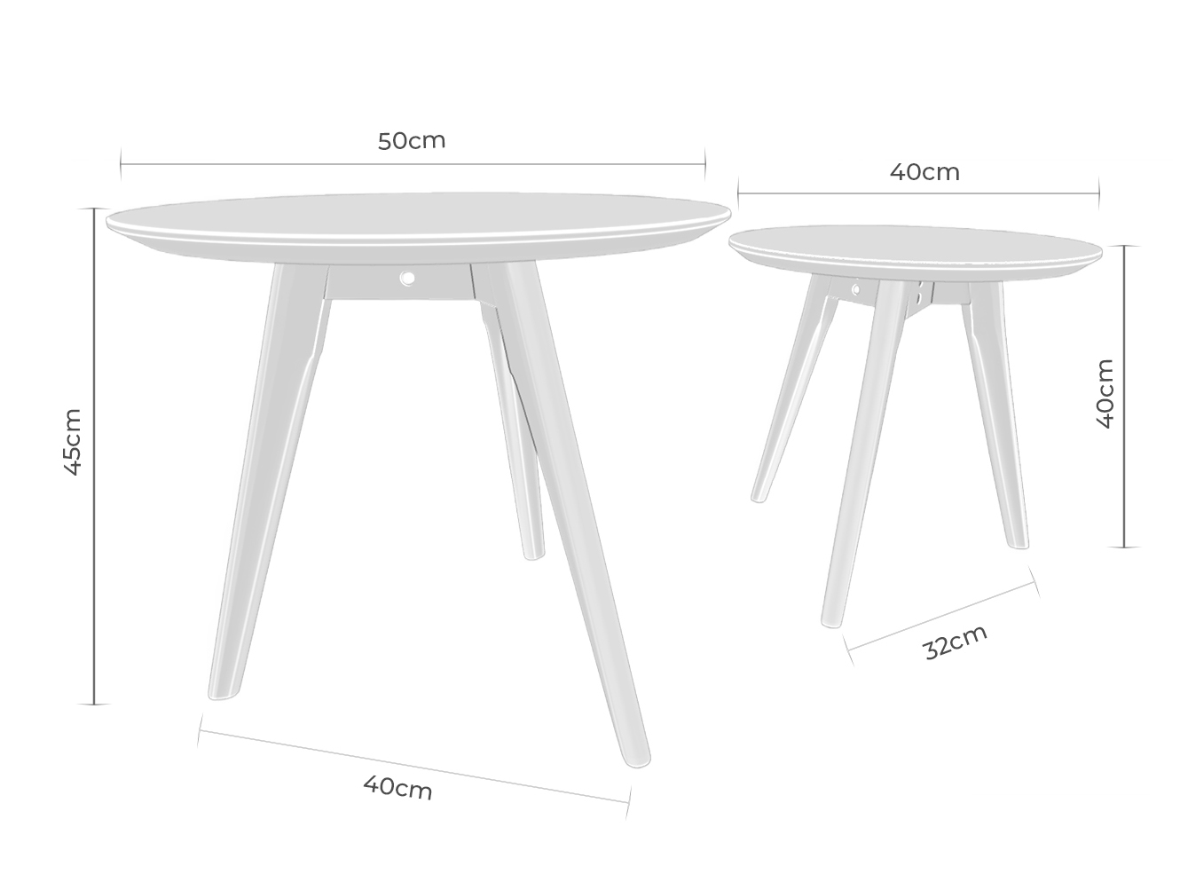Cada mesa presenta una tapa redonda de chapa de roble de 2 cm de grosor, con un acabado suave y natural que realza la belleza de la veta de la madera. Las patas, realizadas en madera maciza de roble, aportan una base sólida y resistente que completa su estética ligera y refinada.