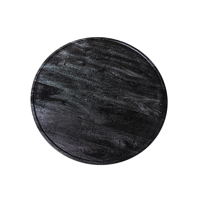 Fabricada en madera de mango con acabado negro profundo, su superficie ligeramente texturizada añade sofisticación y realce visual. La base, con relieves geométricos en forma de cruz, aporta dinamismo al conjunto, contrastando con la suavidad del sobre circular.
