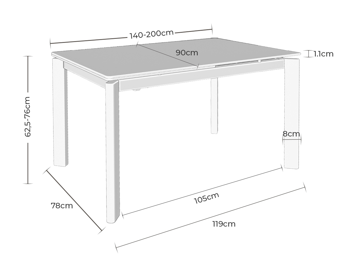 - Ancho: 120 cm (180 cm extendida) / 140 cm (200 cm extendida)