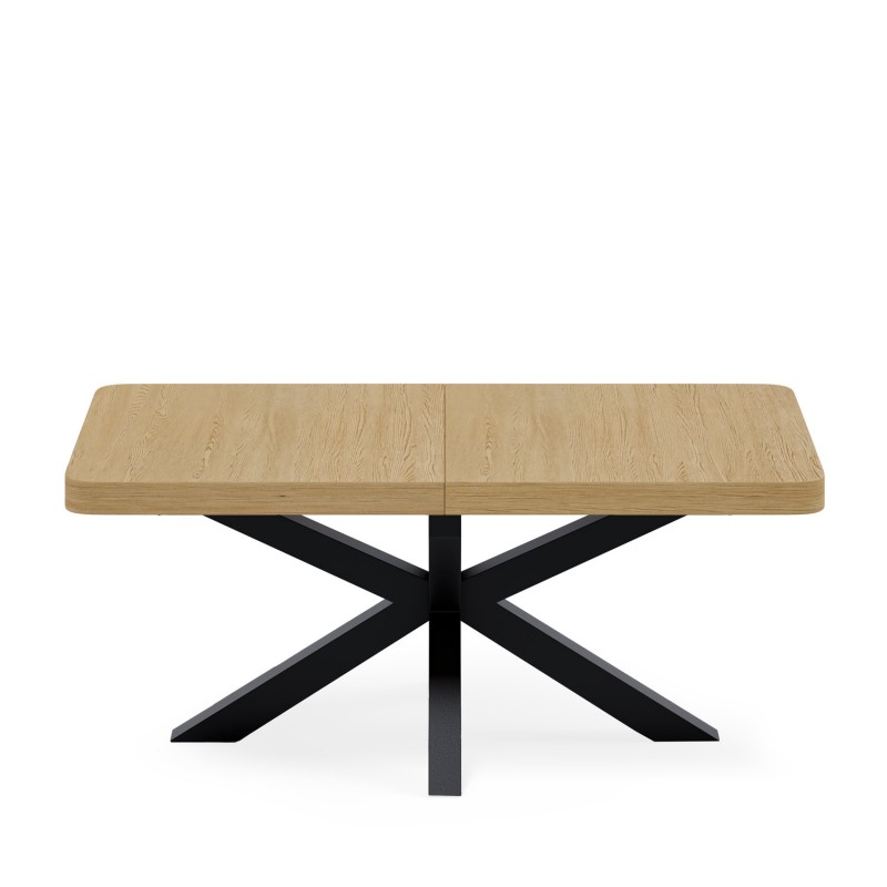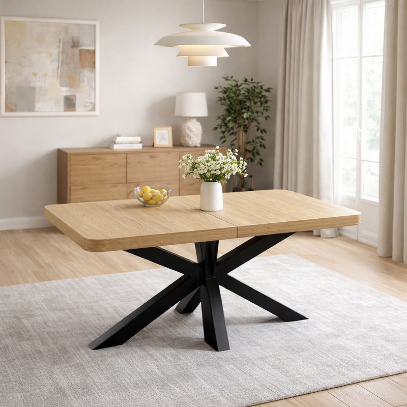La mesa de comedor GLADYS es una mesa extensible pensada para comedores de estilo moderno, nórdico o industrial. Combina una superficie en chapa de roble con una base metálica negra, ofreciendo un equilibrio entre calidez y solidez.
